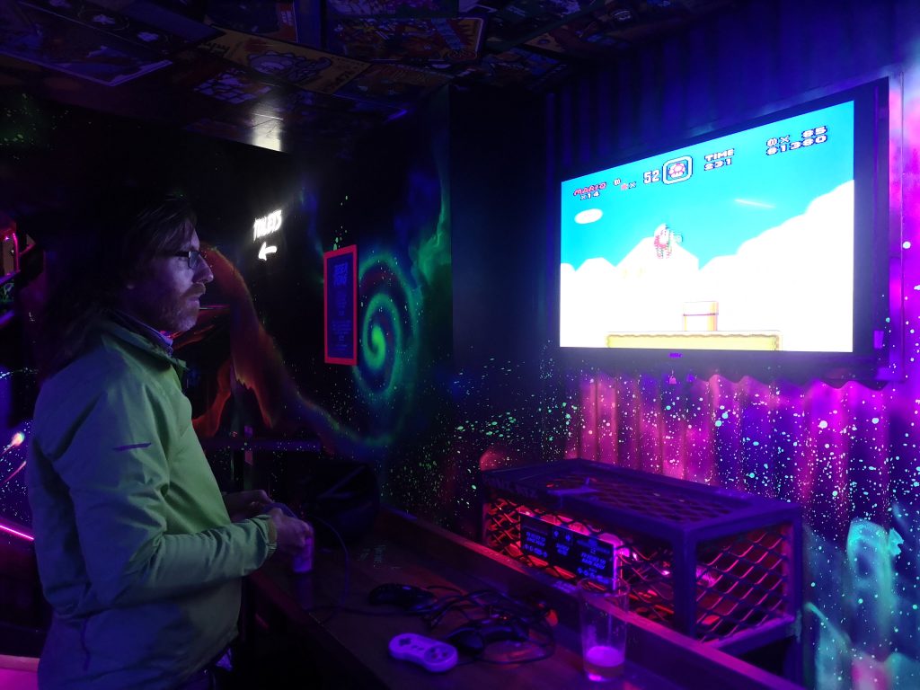 The ‘arcade bar’ had just opened for the evening and the pair are excited about visiting the venue for the first time; one for reliving his childhood on the SNES, the other for playing video games for the very first time.