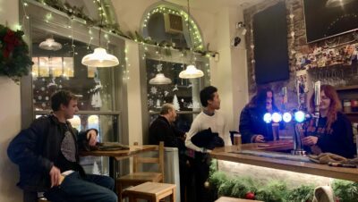 Back inside, the clock stuck 9pm and the group of regulars ordered more pints and continued to while away the bitter night in the historic and well-loved boozer.
