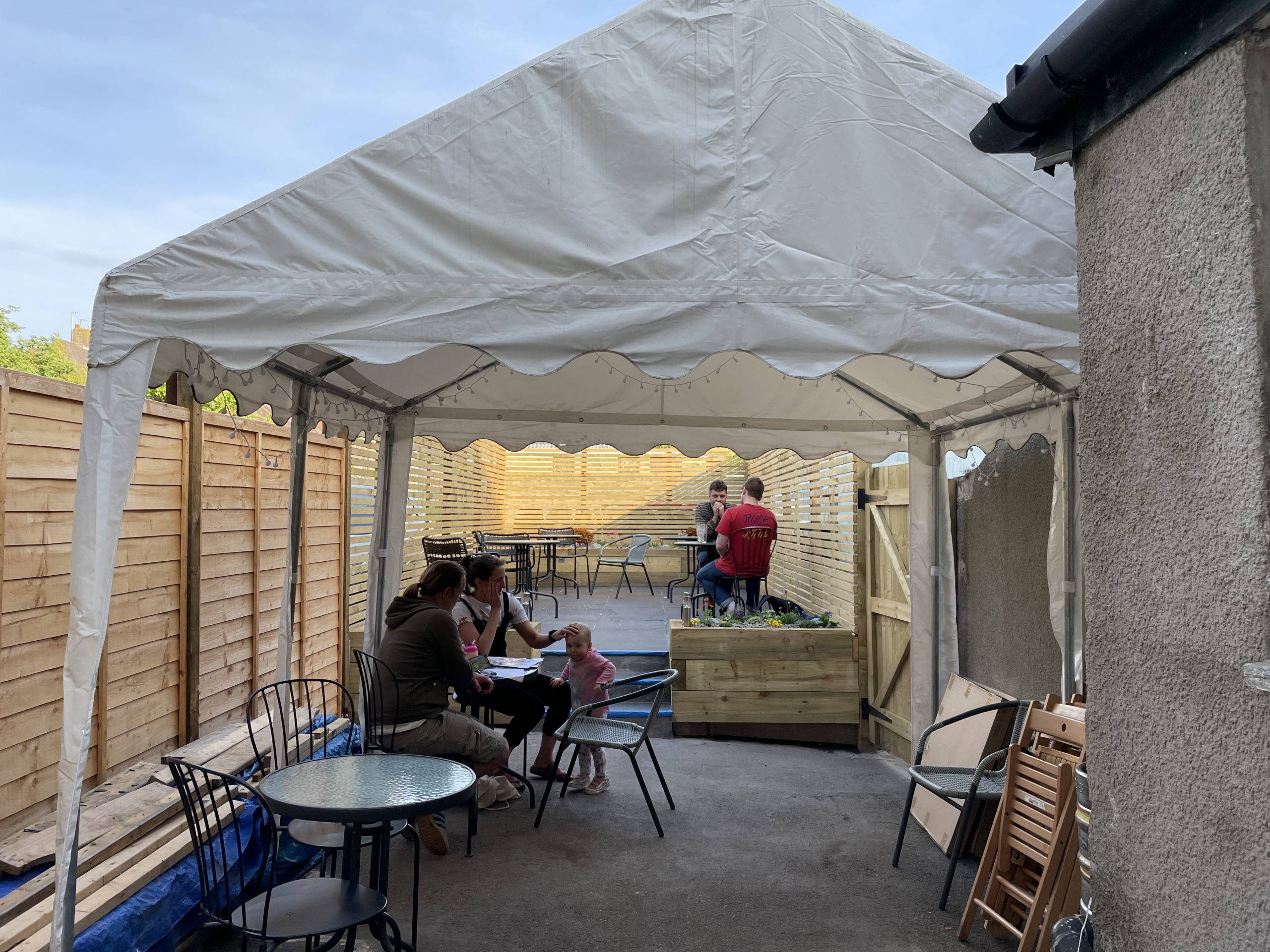 Close by, a couple sat at one of the wooden tables in the shade, sipping leisure pints as their toddler played with crayons.