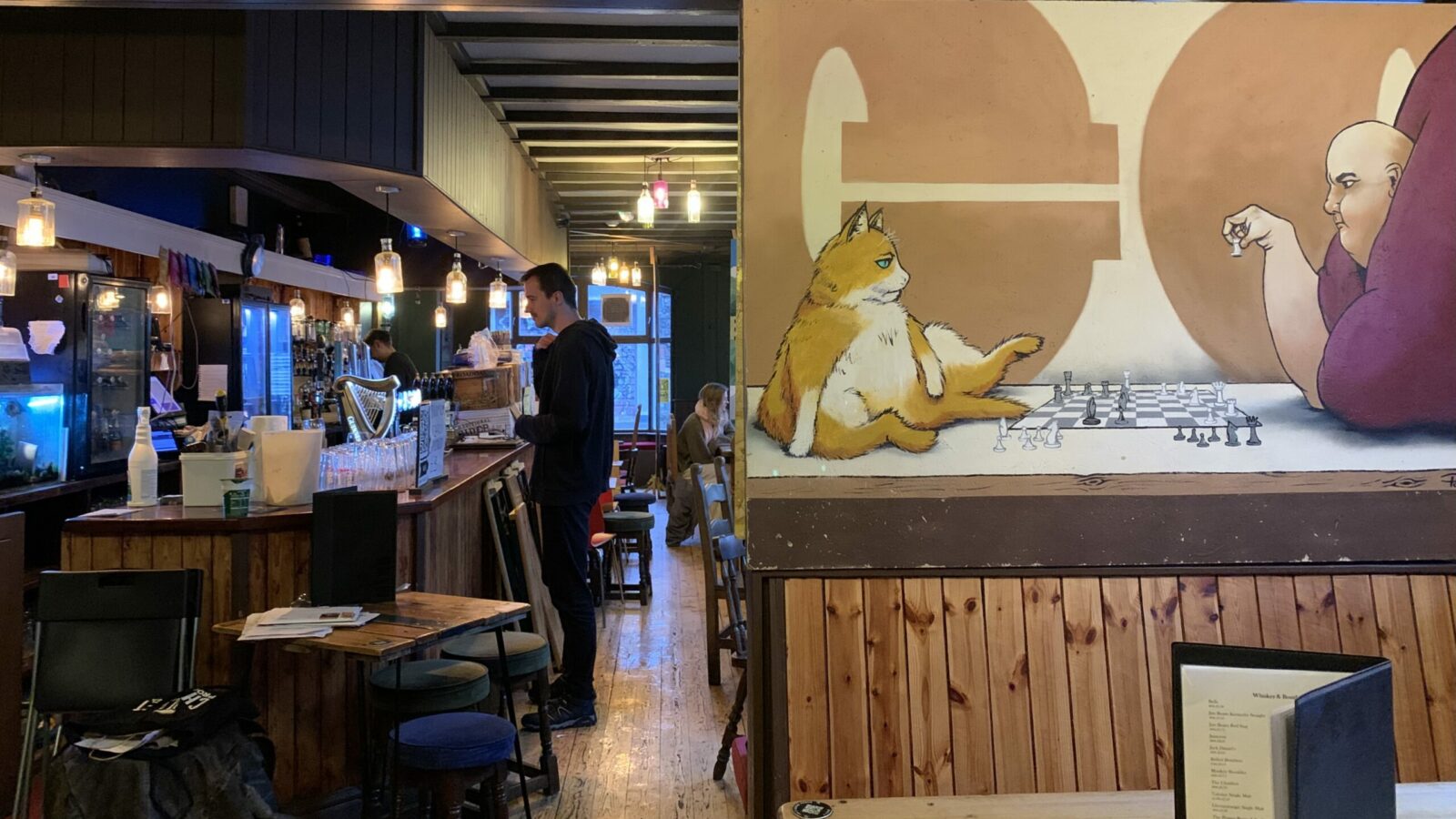 While dogs are welcome, they will have to get past the pub cat, who sits on the bar, swishing its tail as it judges the canine clientele who enter its premises.
