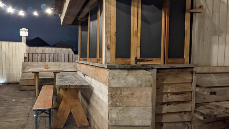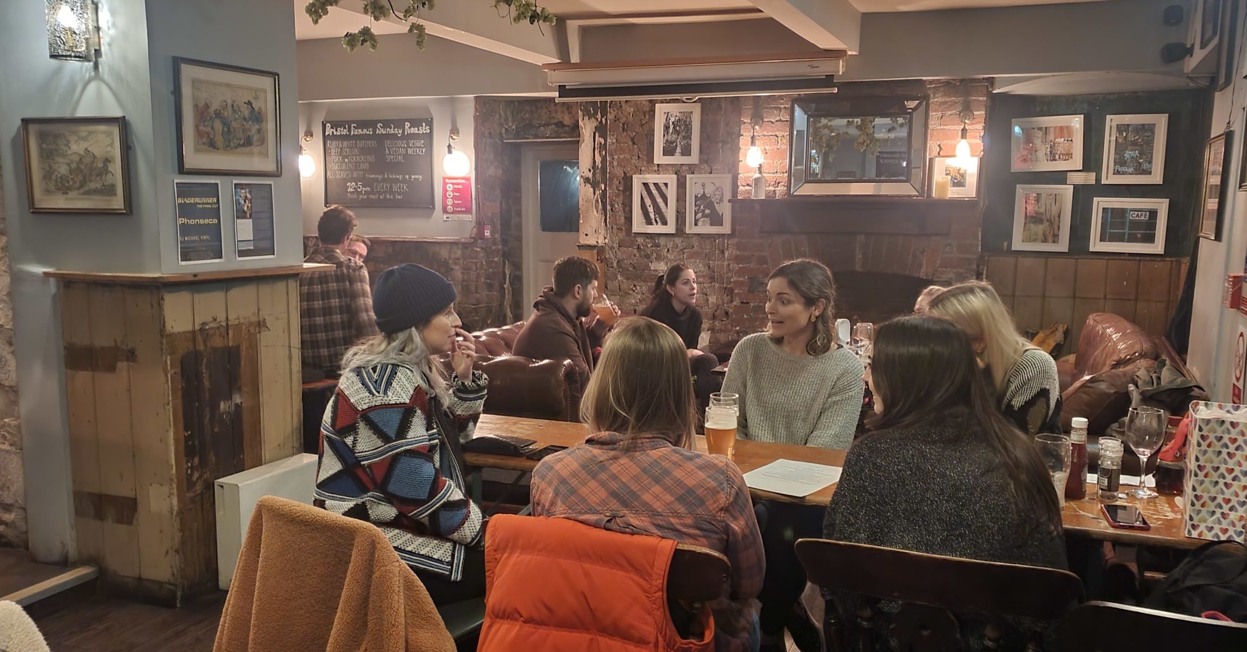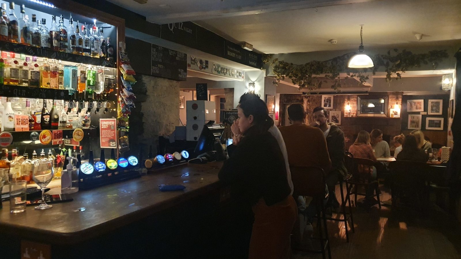 It’s mostly people heading out to smoke making the most of the outside space, each stopping to greet the ever-nosy dog conveniently parked near the door to greet punters as they pass.