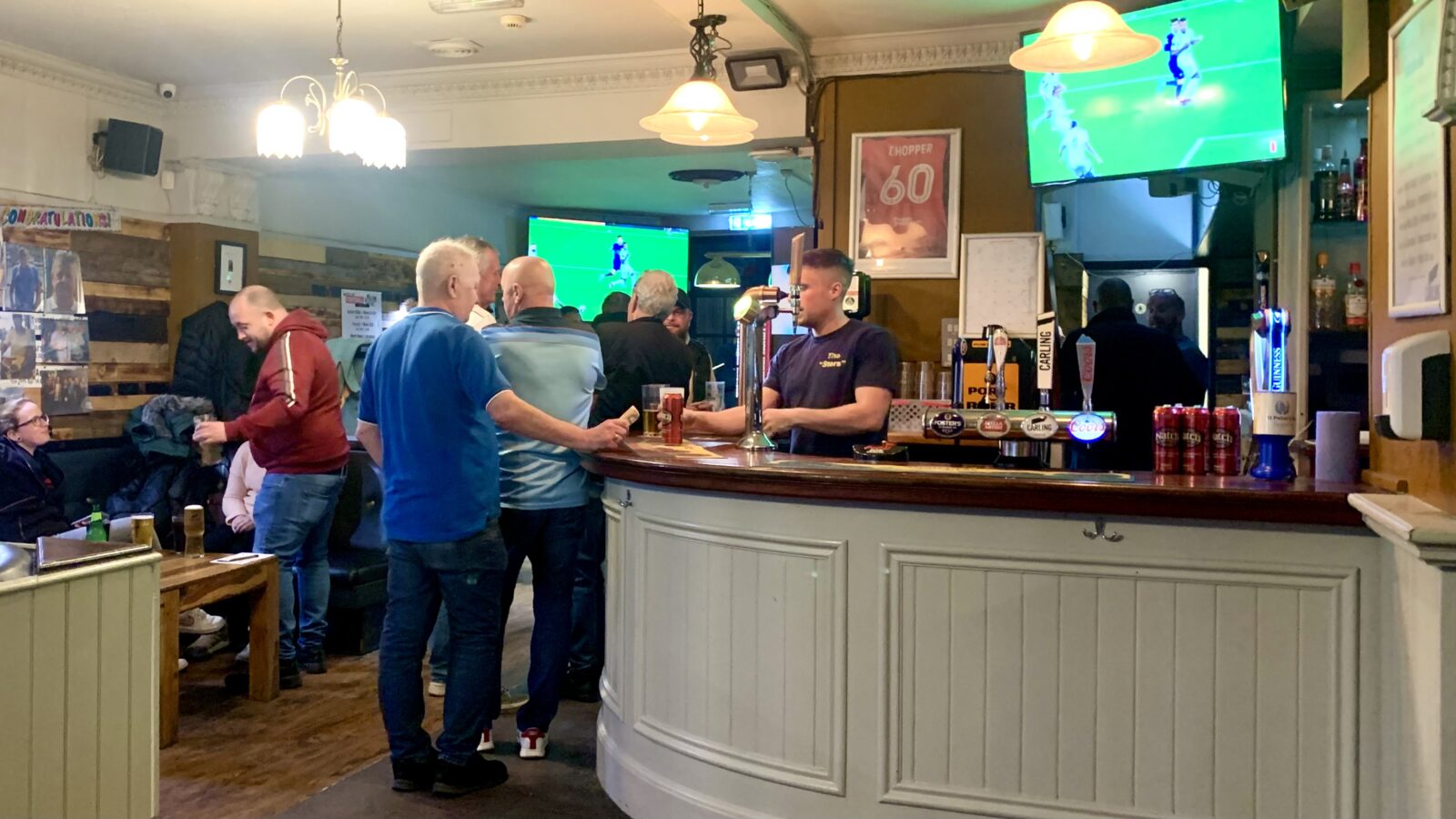 Rugby fixture posters and several ginormous sports screens line the walls, while a comical mix of photographs of locals’ weddings and pool competition winners are hung up in an almost shrine-like collage on one wall.