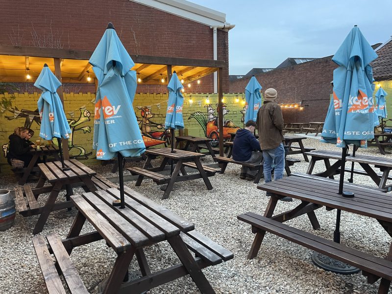 Some friends escape the hubbub of inside for a quick vape in the boozer’s rear where all is quiet as darkness falls, the only noise the growling of cars on the road and quiet chatter from patrons.