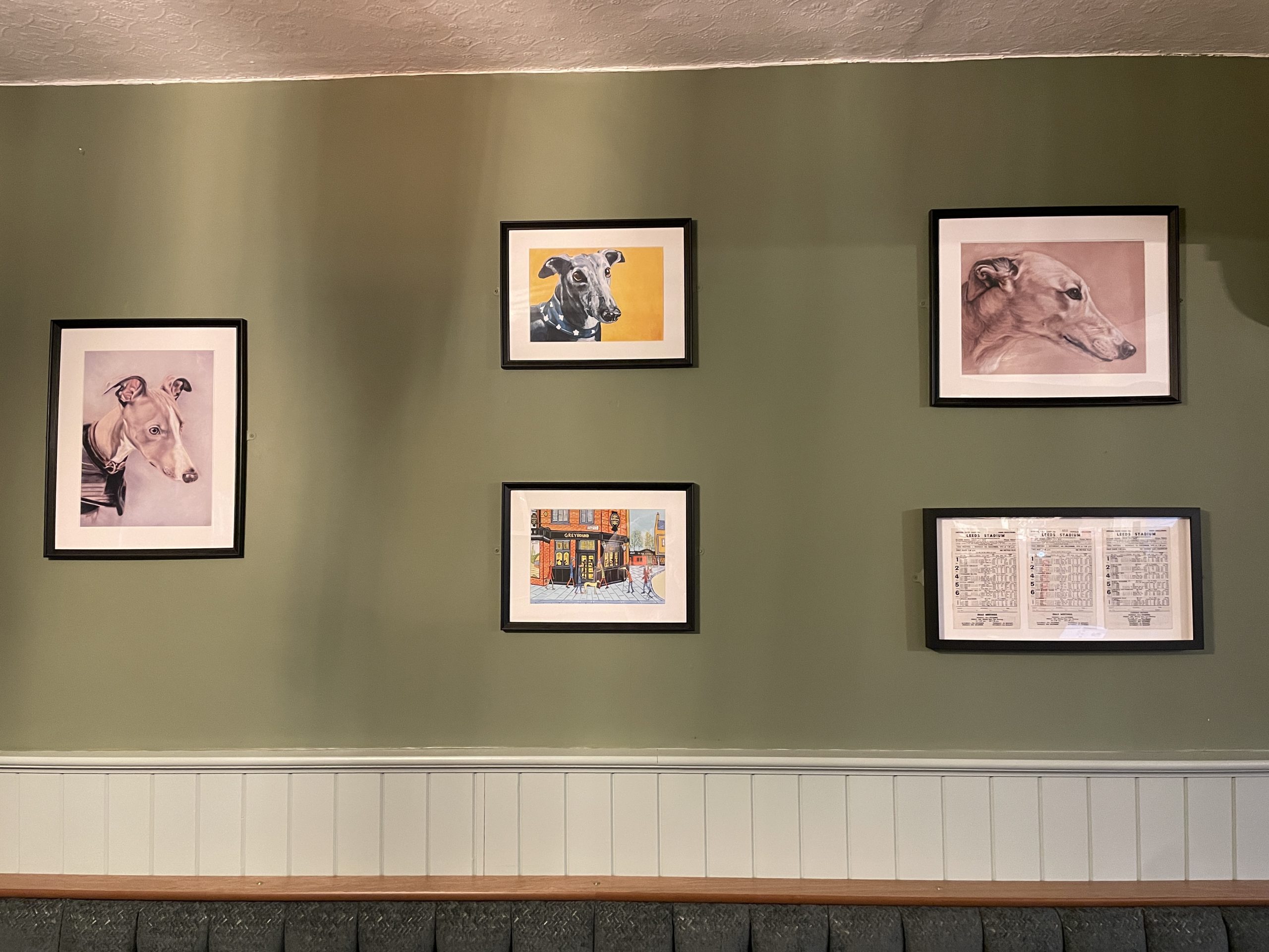 The canine-themed decor continues throughout with greyhounds popping up wherever you look, from sculptures on the bar to illustrations and photographs adorning the walls to more murals lining the beer garden.