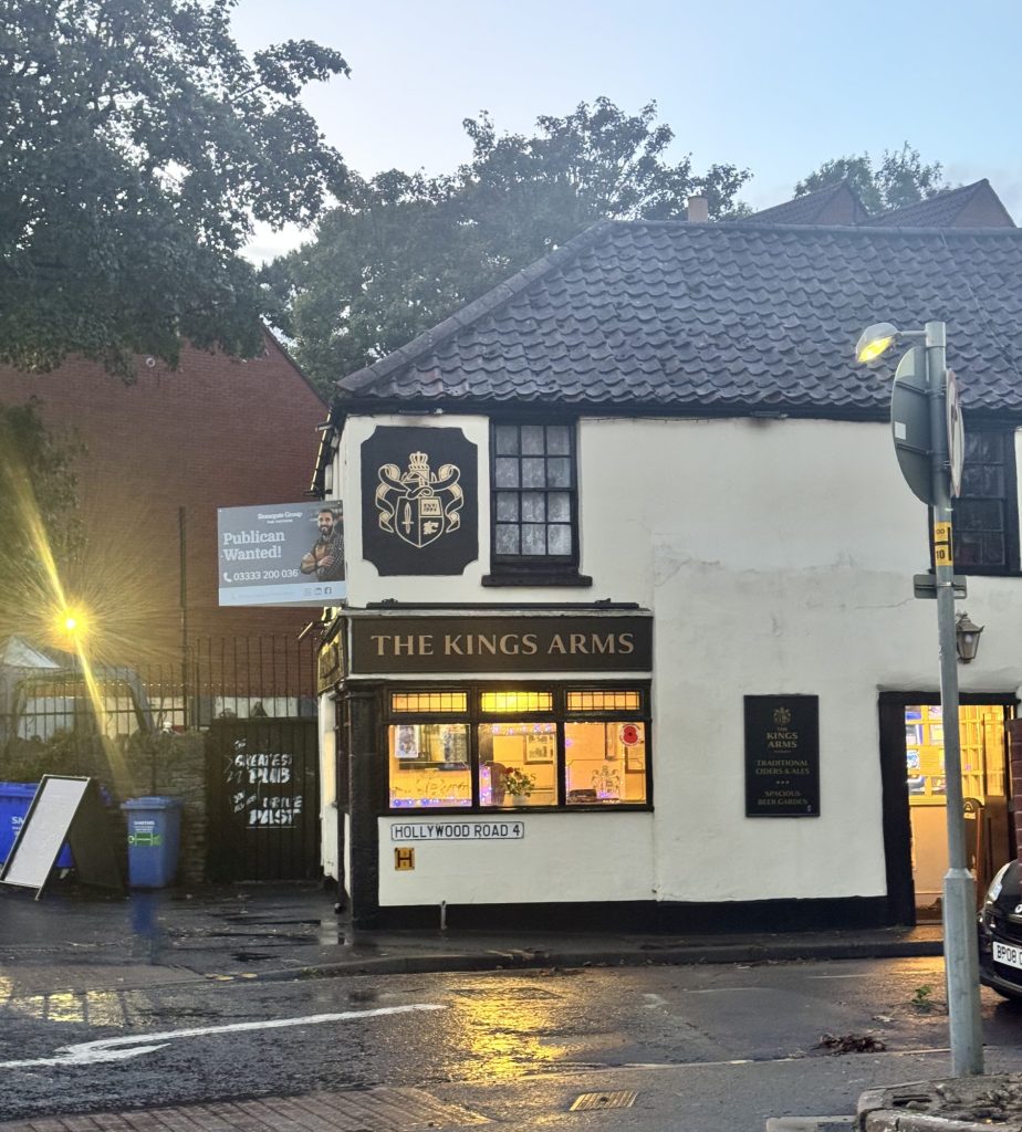 A sign sticking outside of the Kings Arms advertises for a new publican