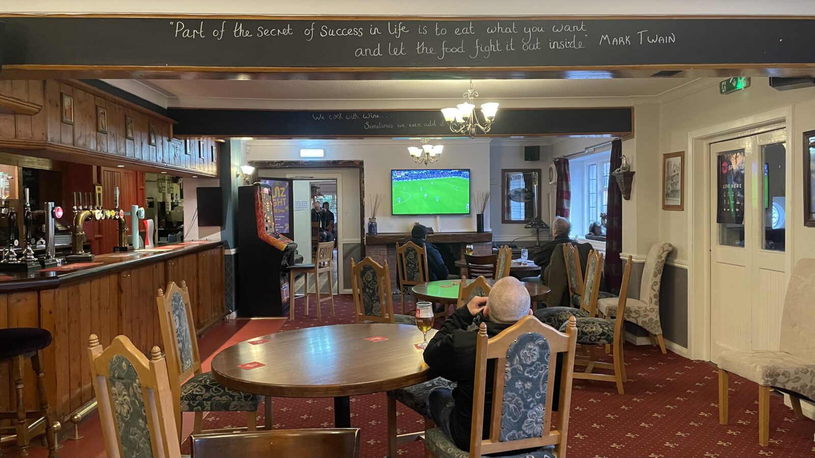 He finds another machine as most people in the pub take no notice of him, their focus on the televisions playing the closing few minutes of Everton versus Aston Villa.