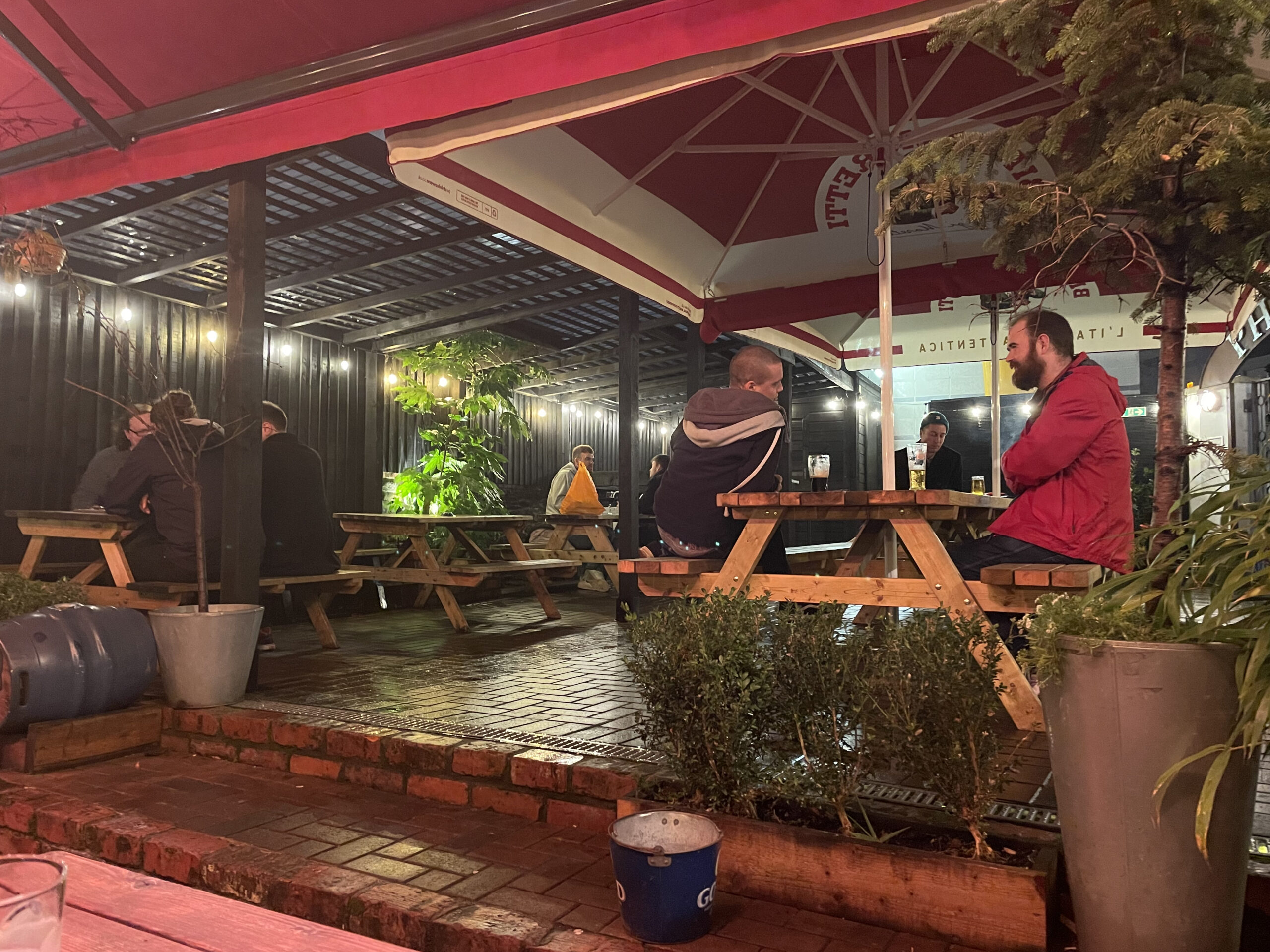 The rain lashed down and wind whipped as a dozen people hunkered down in the beer garden of the Phoenix.