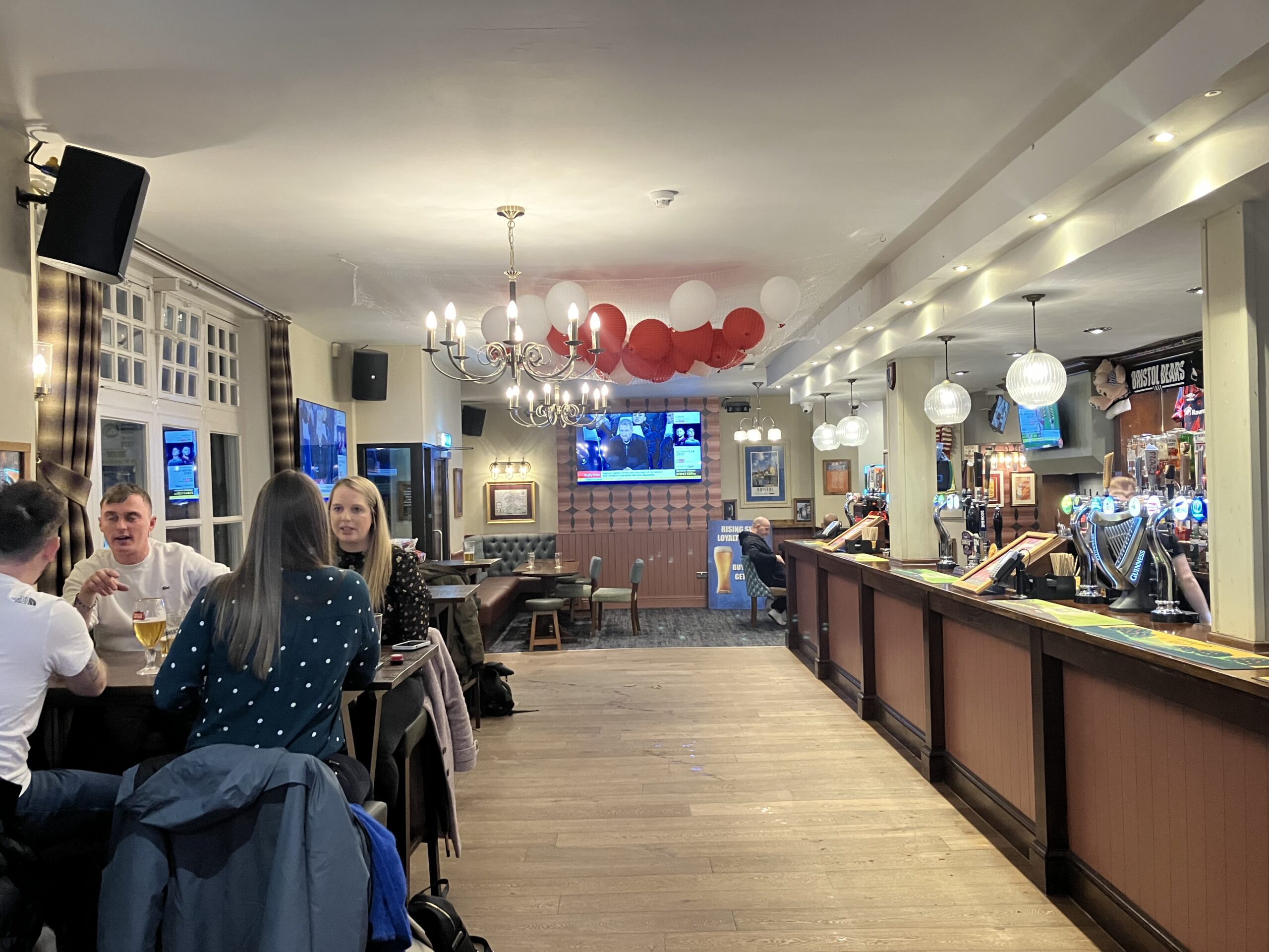 Netting attached to the ceiling in front of the bar holds red and white balloons, inside three of them hold a free pint token, which locals get a chance of winning at the weekends.