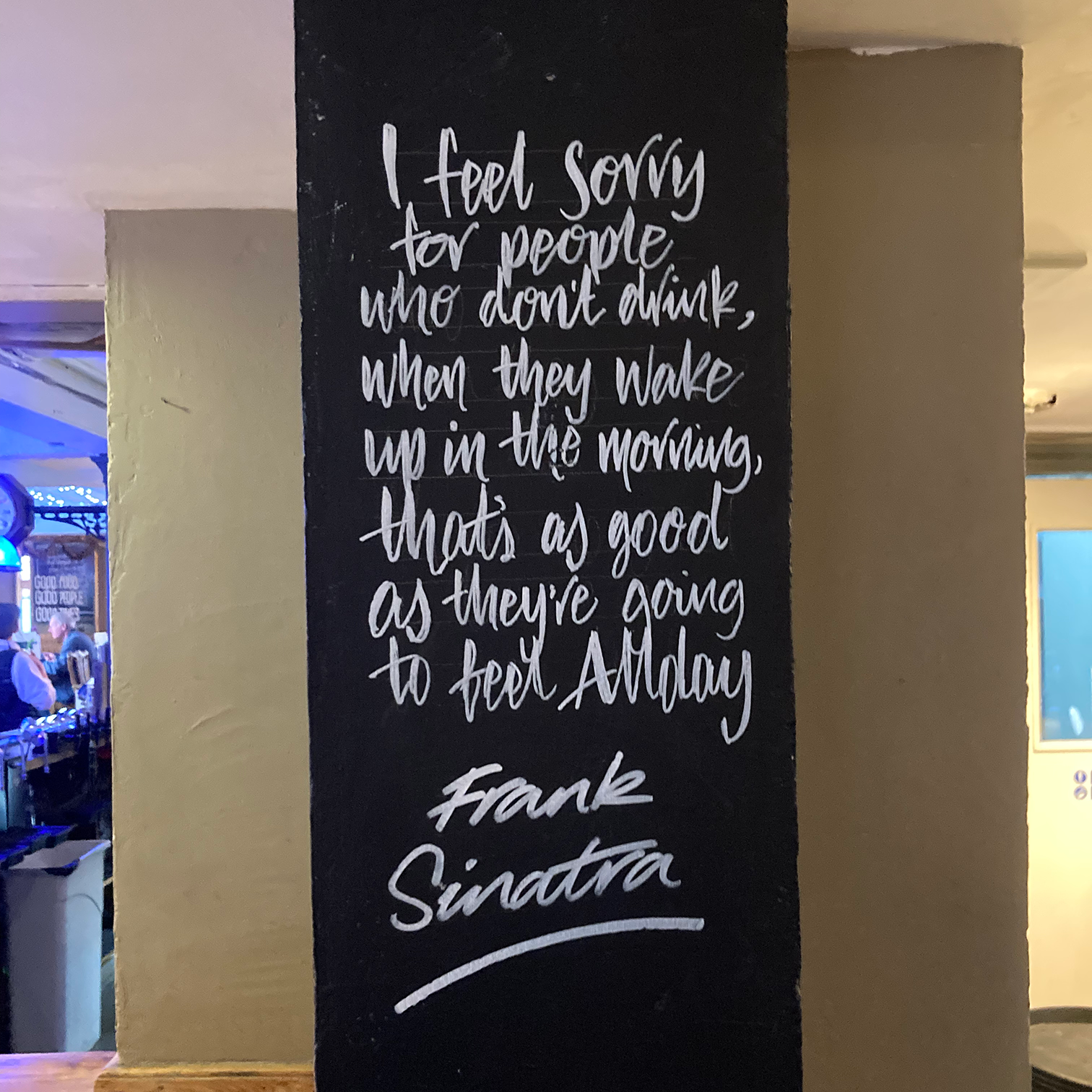 Inside, the theme of inspirational quotes continued. Proverbs on happiness, coffee and quotes from Frank Sinatra were written on the walls in a handwriting that, whilst stylised, became very difficult to read after the first couple of words.