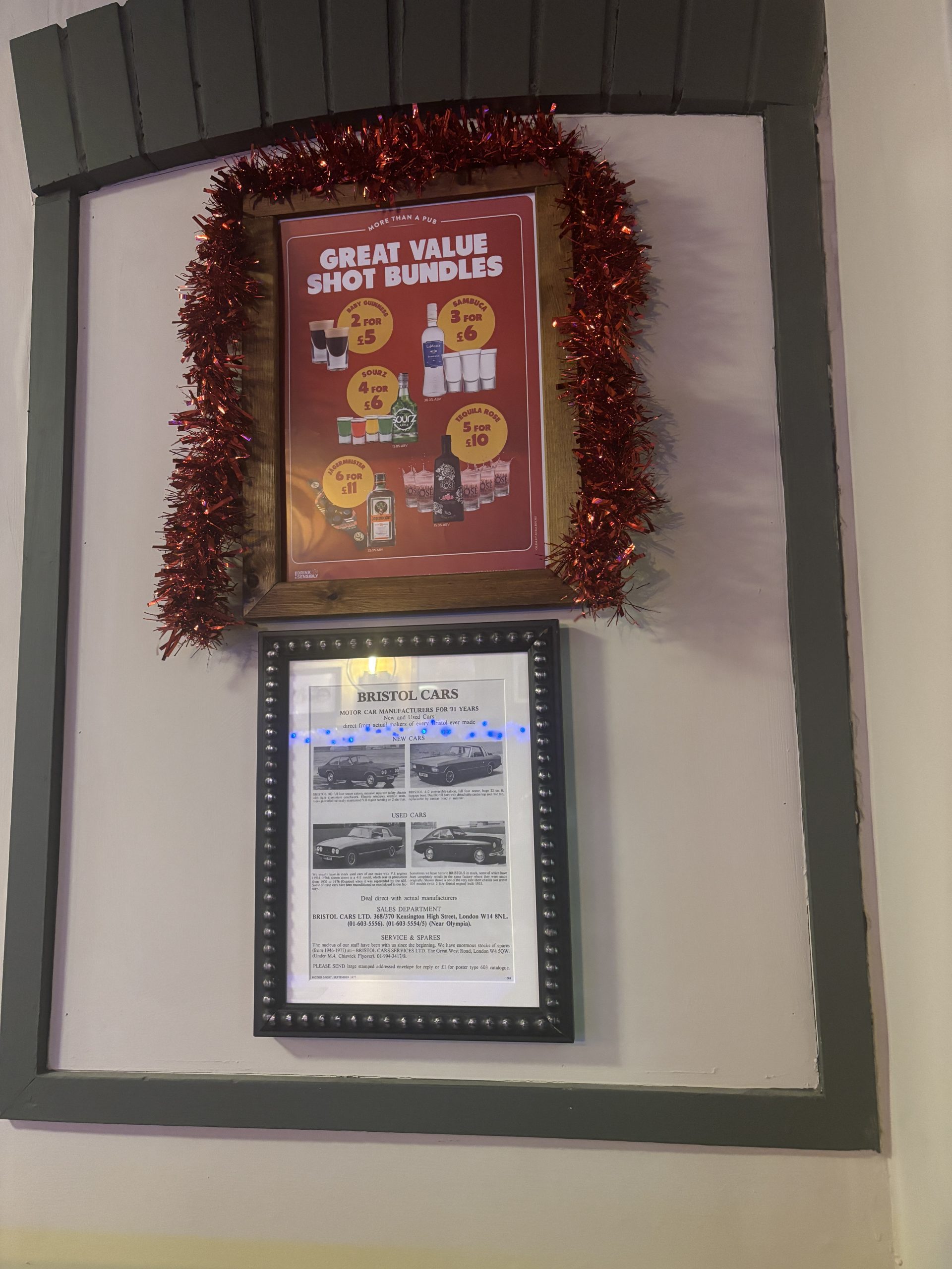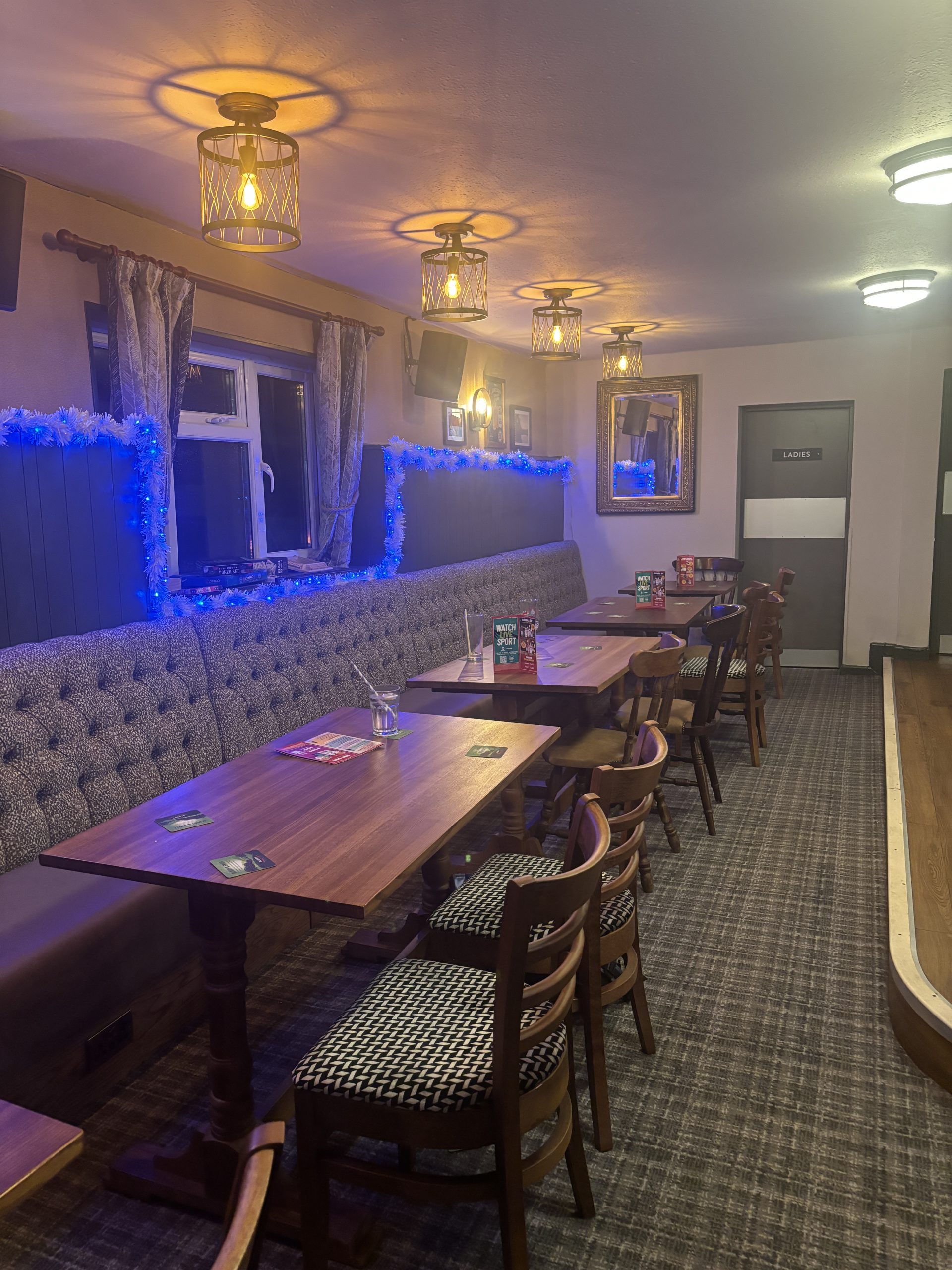 There are at least two miniature Santas dotted about the bar, tinsel hanging from the roof and a large white snowflake dangling from a corner.