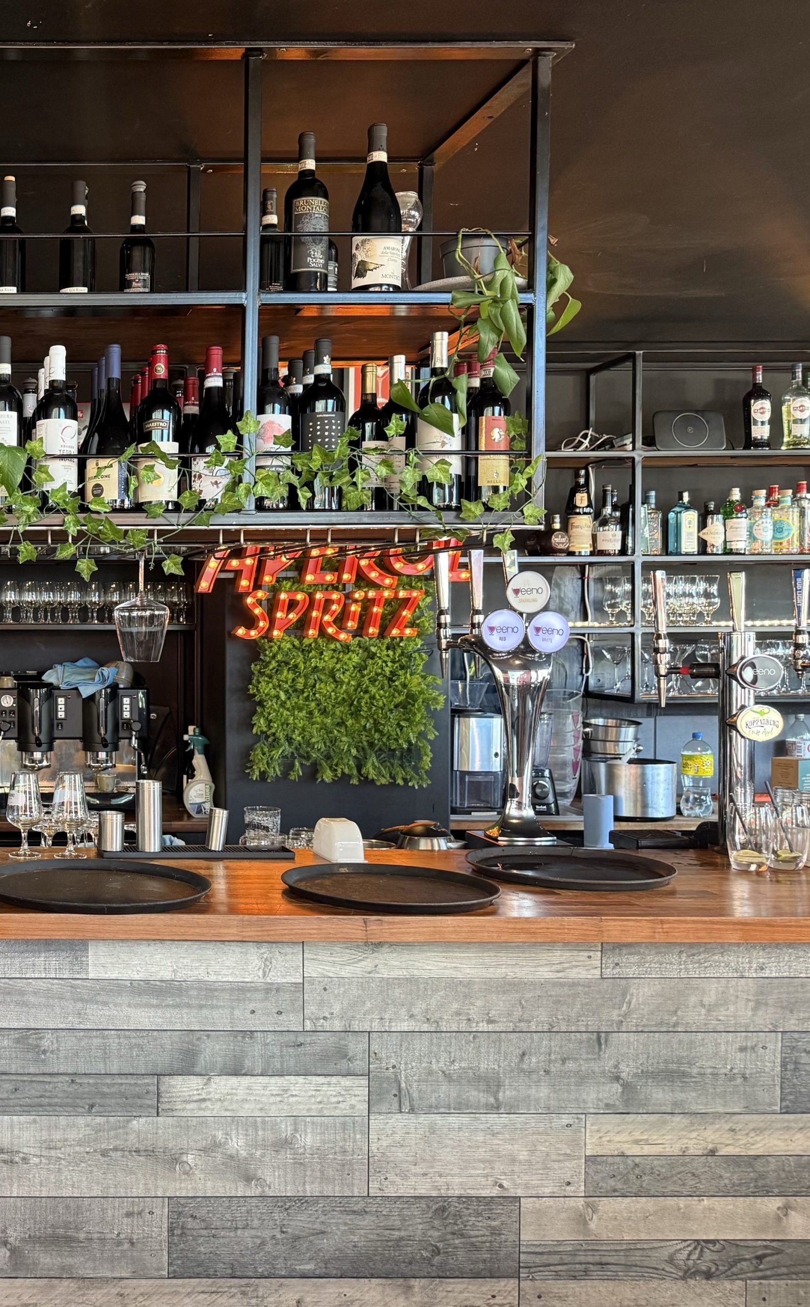 Veeno aims to replicate the Italian Aperitivo experience, and clearly, they have appealed to the right audience. Bottles of spirits and wines adorn the shelves, which are draped in greenery, a cosy contrast to the corporate atmosphere.