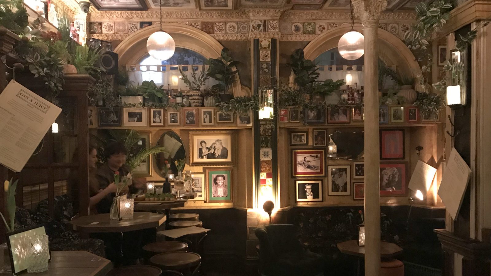Some botanic gardens would be envious of the amount of greenery dripping from shelves and alcoves, columns would not look out of place in a replica Greek temple, tiles could fit into a Spanish hacienda and empty bottles of gin on each table hold flowers.