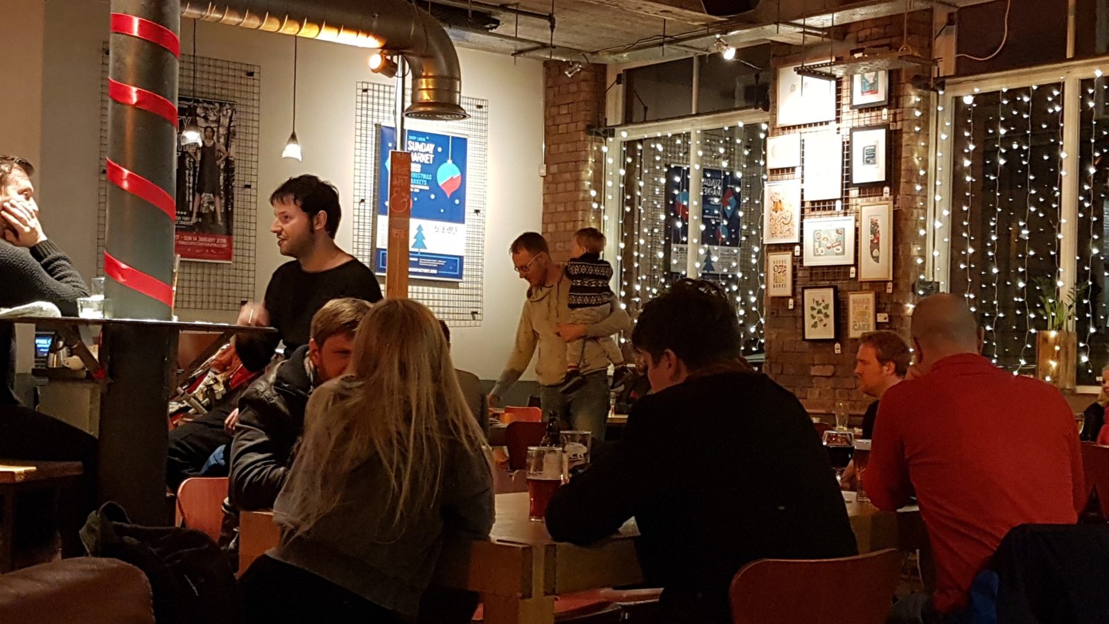 The vast venue doesn’t naturally lend itself to cosiness, yet with Christmas lights twinkling from every available surface, work from Bristol artists adorning the walls, baked goods sitting temptingly on the bar and tantalising aromas drifting from the open kitchen, the atmosphere is decidedly cheery.