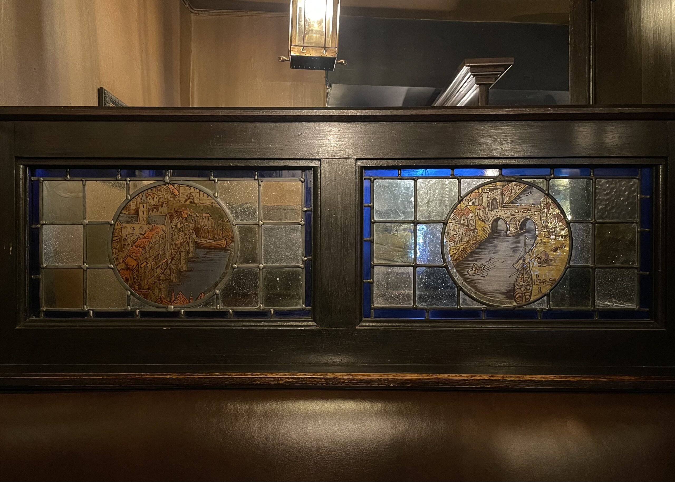 Inside this particular booth were two small hand painted stained glass windows showing the former bridge over the River Frome close to where Christmas Steps are today; and Bristol Bridge when it still had houses all the way along it and a chapel in the middle.