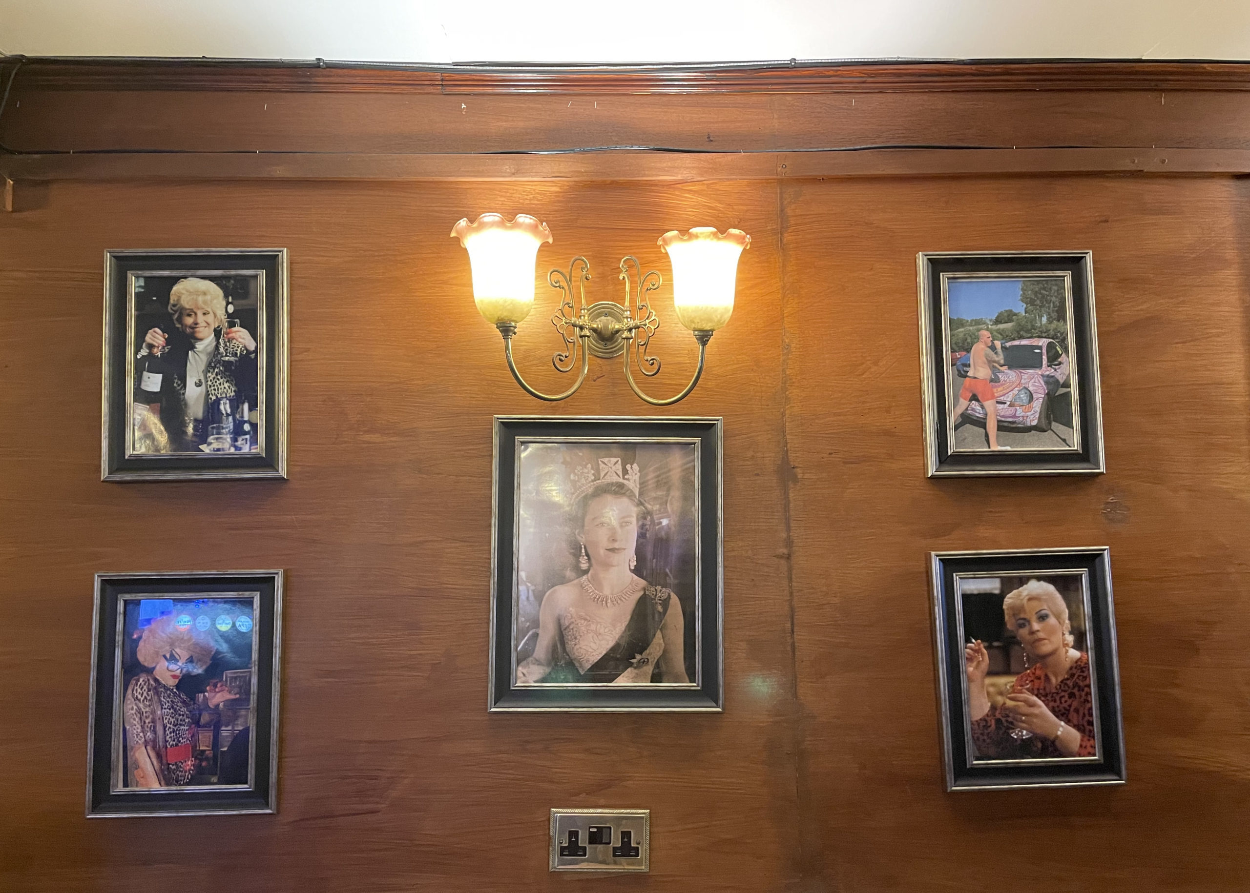 One such curiosity was the wall of framed photos hanging opposite the bar. The ‘wall of queens’, as we were told, starred Barbara Windsor, Pat Butcher and a young Queen Elizabeth in the centre.