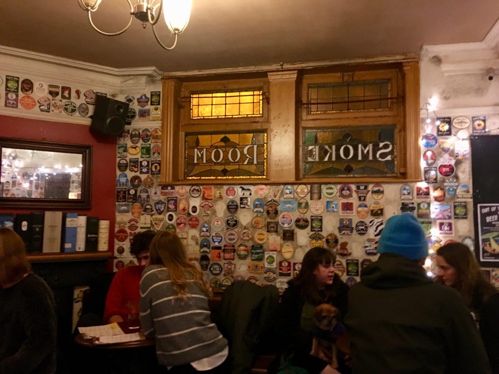 The wall behind them is a patchwork of hundreds of old cardboard pump clips, crossed by fairy lights and dried out hop bines that tangle as they meet above the bar.