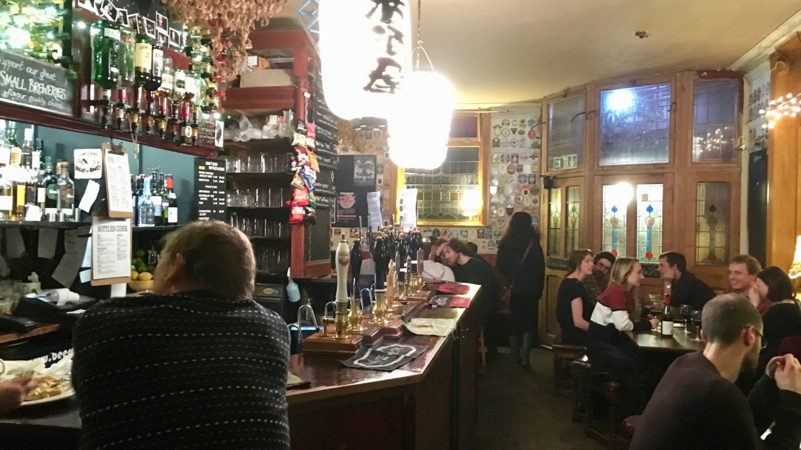 The new group on the round table browse the menu, drum on their pint glasses with sets of chopsticks, and then squeeze up tight as more friends join them with foaming pints.