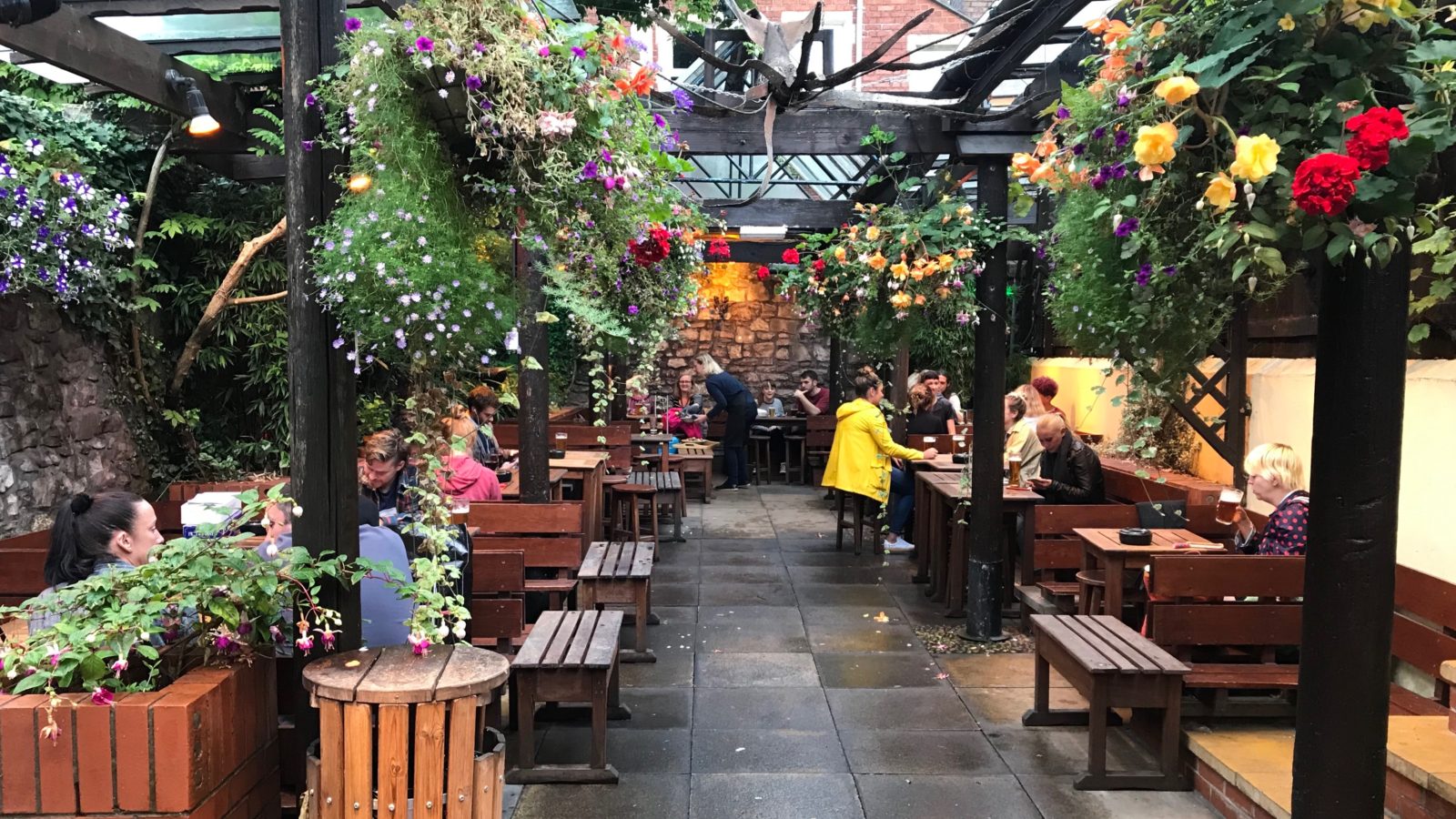 It may have been raining on Wednesday but the garden was still full of customers sheltering from the wet among gloriously colourful hanging baskets, sharing even more stories.