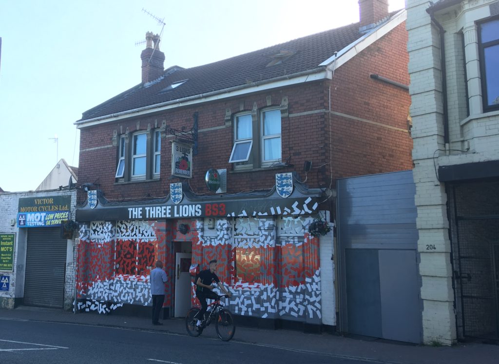 Within spitting distance of the steel spires of Ashton Gate Stadium, visible through hazy evening sunshine down at the bottom of the hill behind the pub, The Three Lions unashamedly – aggressively – loves its football. Decorated with a massive St George’s cross decal that stretches right across the front windows and a a trio of shields with three lions on, there couldn’t be a more patriotic spot to watch the opening night of the 2018 World Cup.