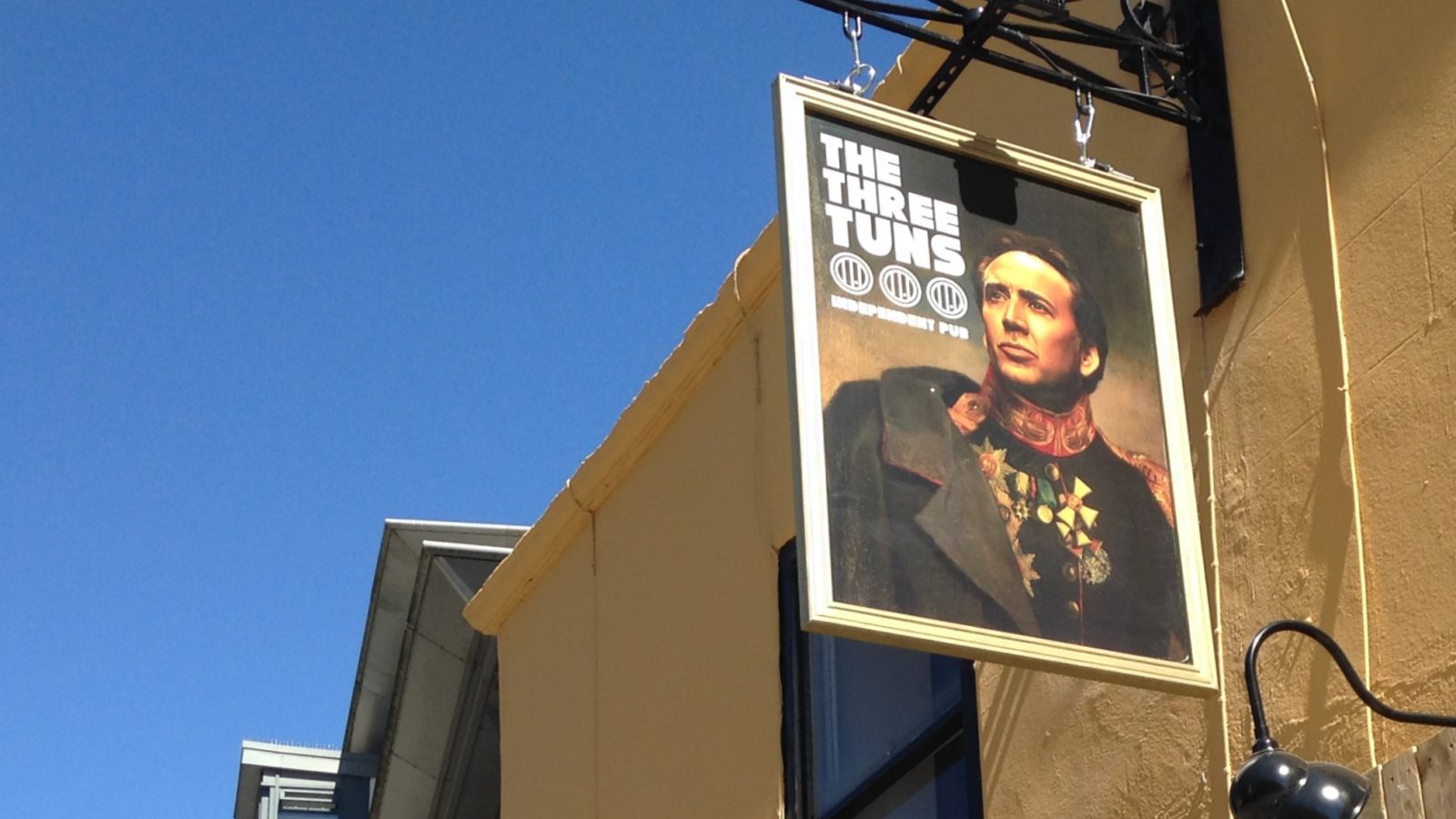 Nicolas Cage stares down at visitors entering the Three Tuns on St George’s Road.