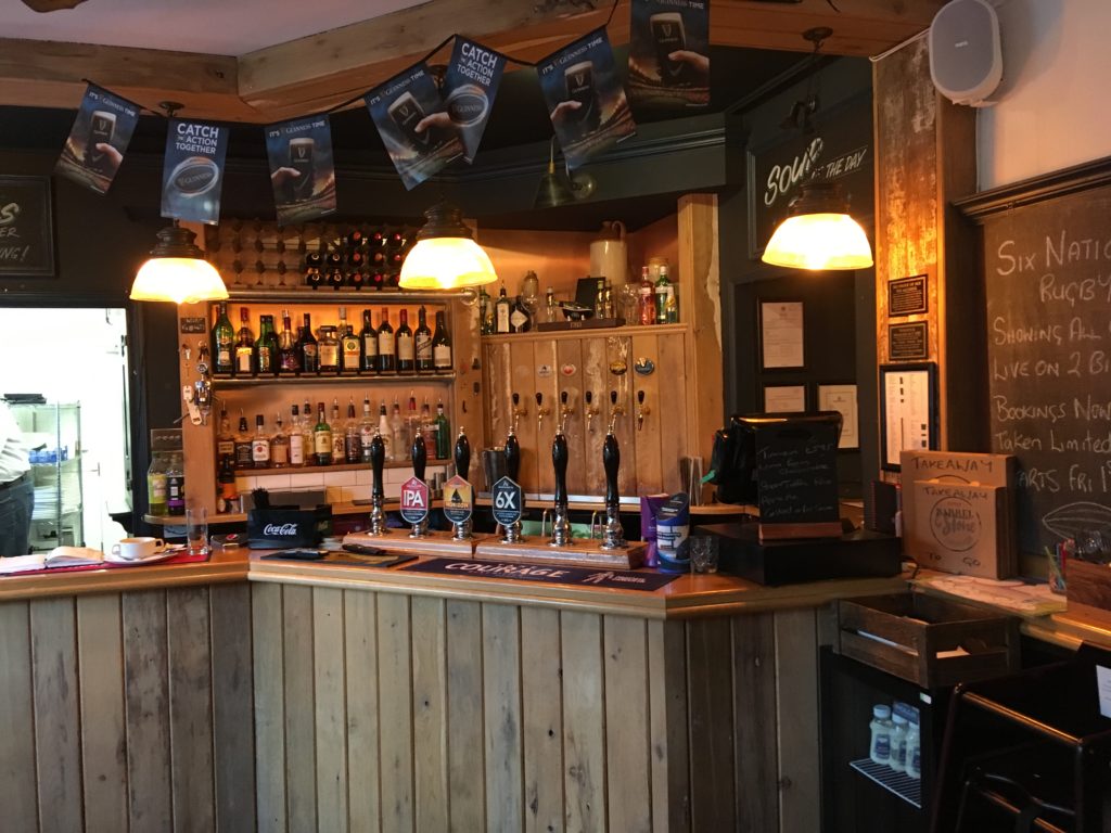 The fire isn’t lit in the front portion of the pub on this weekday lunchtime but the TV above blares away, Judge Judy laying down her personal brand of the law. Black and white prints of old Westbury Village adorn the walls along with old farming notices, and a big brass fan hangs from the ceiling.
