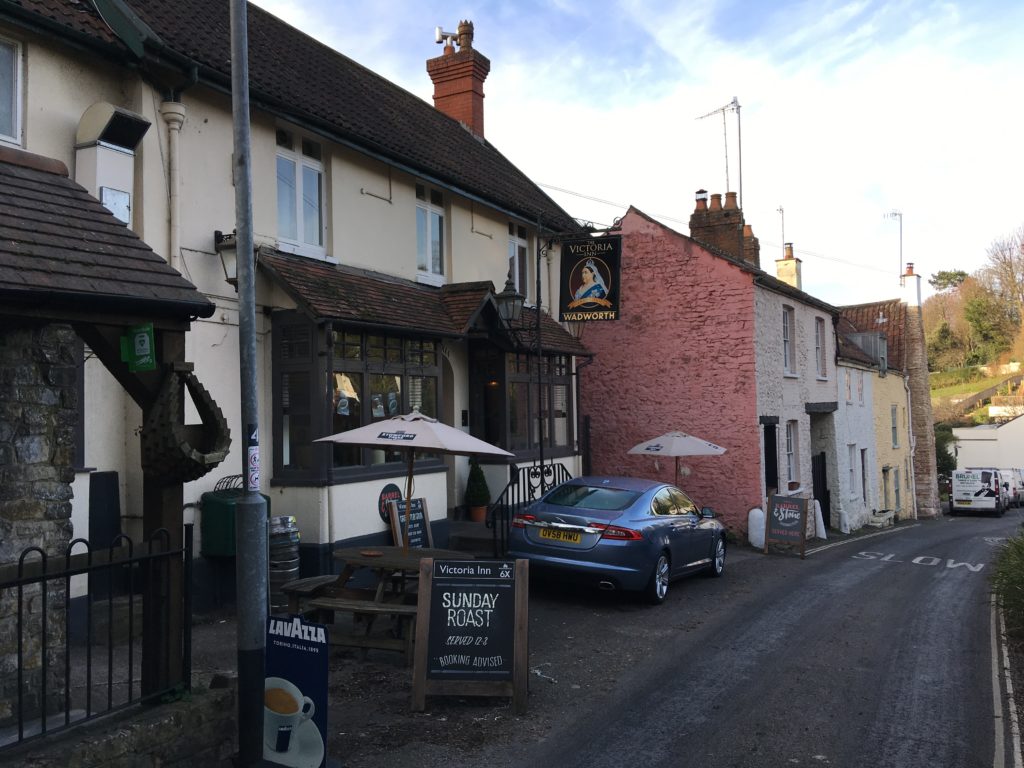 Tucked away down a single-track lane and flanked by pastel-hued stone cottages, with wooden lintels of the sort that a couple on Escape to the Country would gleefully squeal over, the Victoria Inn stands smoothly symmetrical. A swinging portrait of the queen wearing a veiled crown hangs on a wrought iron stand above the leaded glass pane in the door marked BAR. The outside benches are unoccupied on a bitterly cold weekday lunchtime, but inside it’s warm and inviting, with two types of soup on the pub lunch menu.