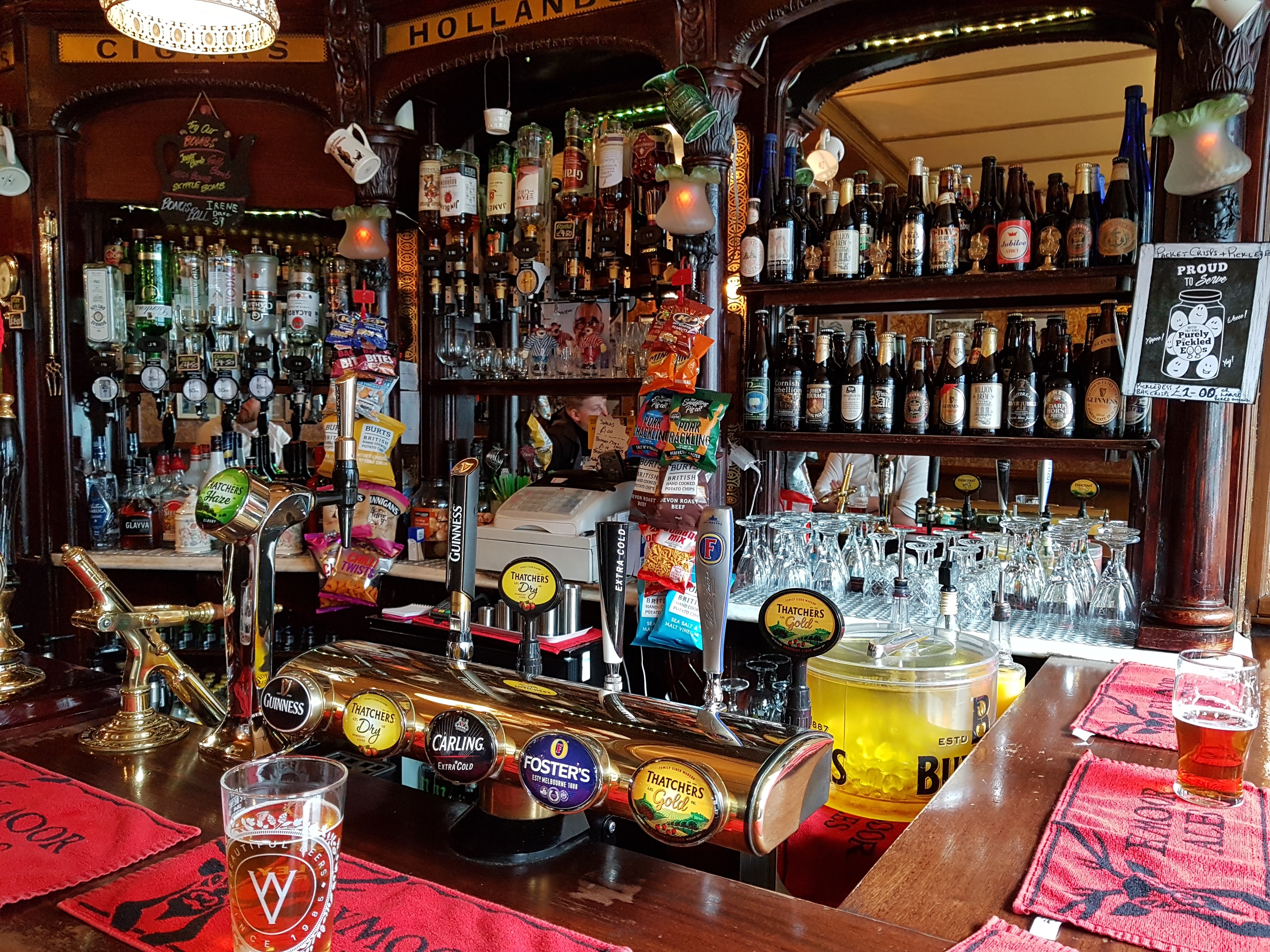 The trappings of a proper, traditional pub continue with pickled eggs available behind the bar, along with an assortment of crisps and snacks, and many real ale and cider pumps – all well-worn from use.