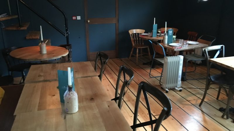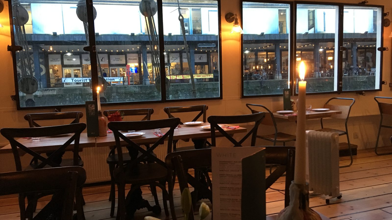 Behind the bar is the familiar array of good beers on tap, including Bath Ales and Beerd, and spirits including almost a dozen gins, while on the table is a comprehensive wine list. Cocktails are also available, made fresh by the talented staff. The new wooden tables with their cast iron feet are set for dinner, with clean white crockery, fresh flowers and candles. While the menu of tapas and stone-baked pizza hasn’t changed, the new lighter, brighter feel to the place is enticing in new diners. A well-dressed couple enter and sit at their table, watching the ferry perform a neat three-point-turn just beyond the windows.