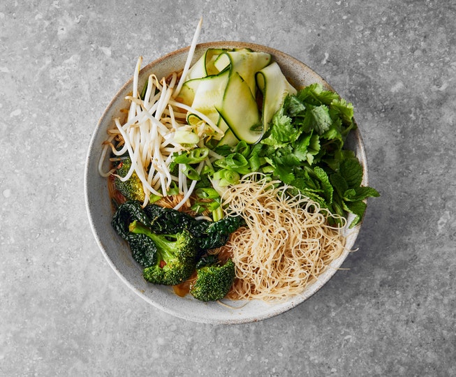 5) Thinly slice the remaining red chilli, roughly chop the coriander and bash up the toasted peanuts.