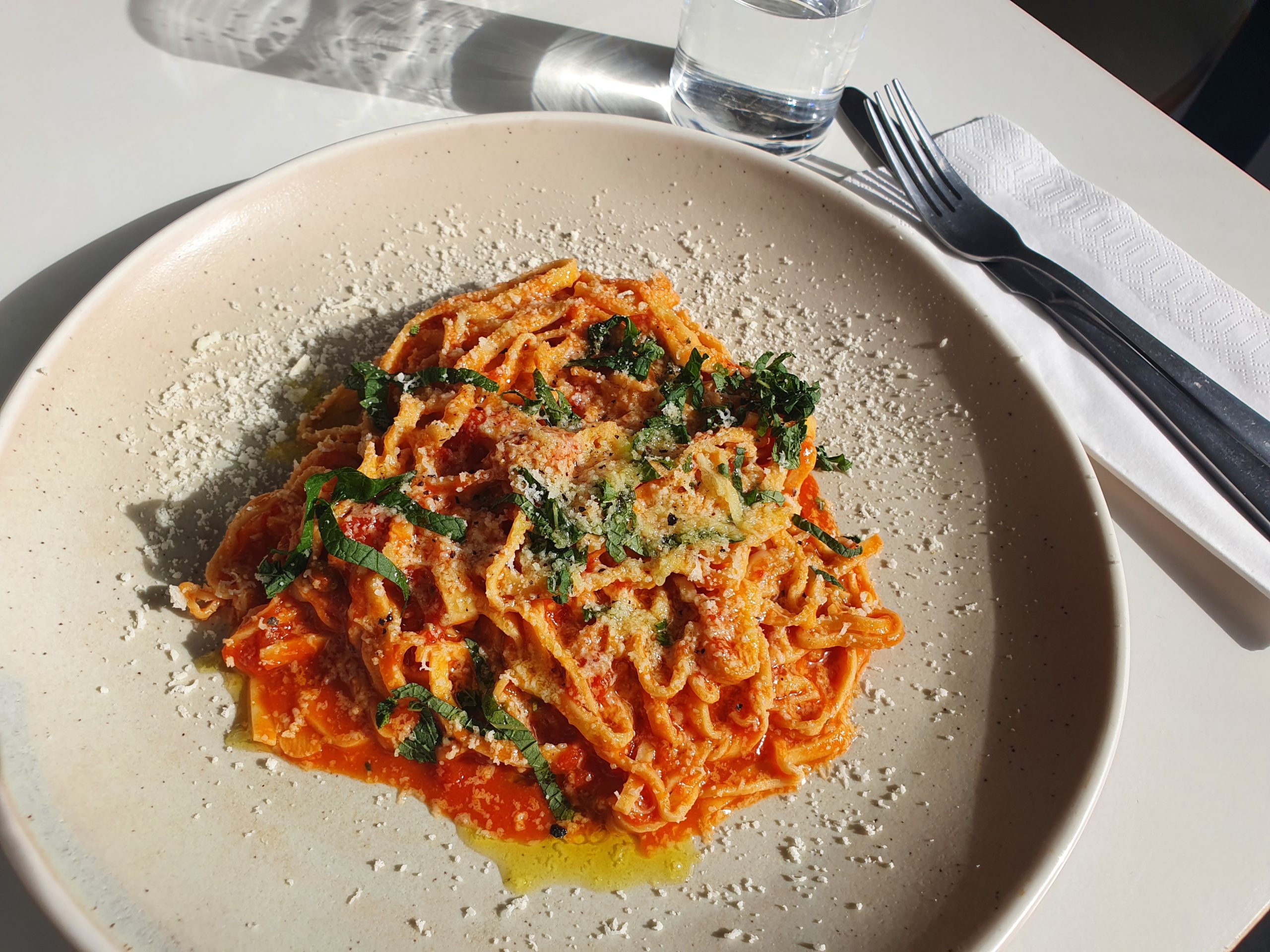 The pasta dish arrives promptly and steaming hot from the kitchen. Piled neatly in the centre of a large plate, the tagliarini – served slightly al dente – is coated in the rich, oily tomato sauce and drizzled generously with pecorino. Green strips of mint add a fresh tang to the dish which is a testament to the joys of a few simple, fresh ingredients skillfully put together.