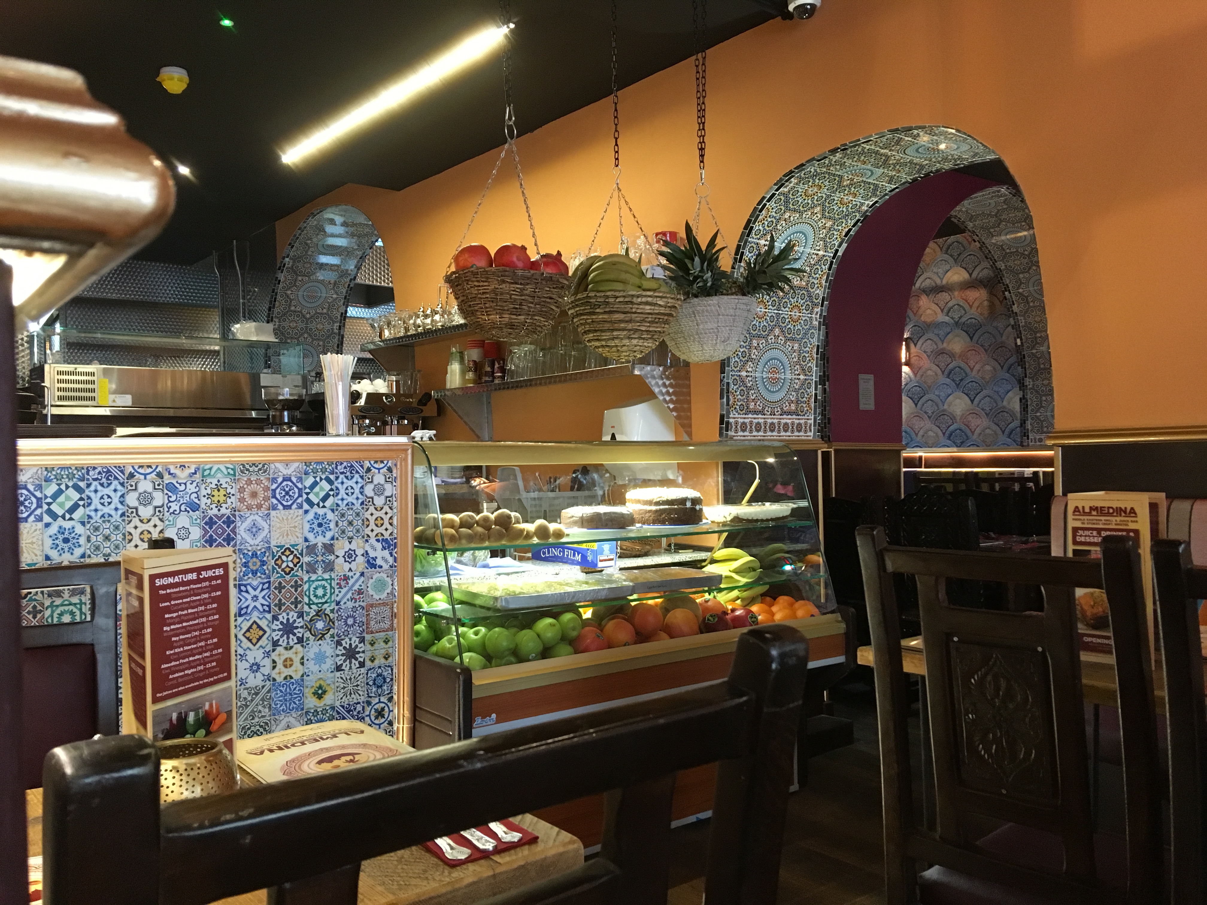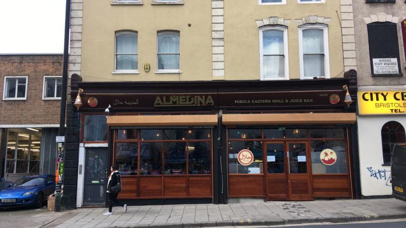 The smell of burning charcoal hits as you step off Stokes Croft and into the double-front of Almedina, a Middle Eastern grill restaurant and juice bar. A man sings soulful Arabic pop over the speakers as the friendly staff motion to a table in the corner, one of a handful occupied one lunchtime during their first week of opening.