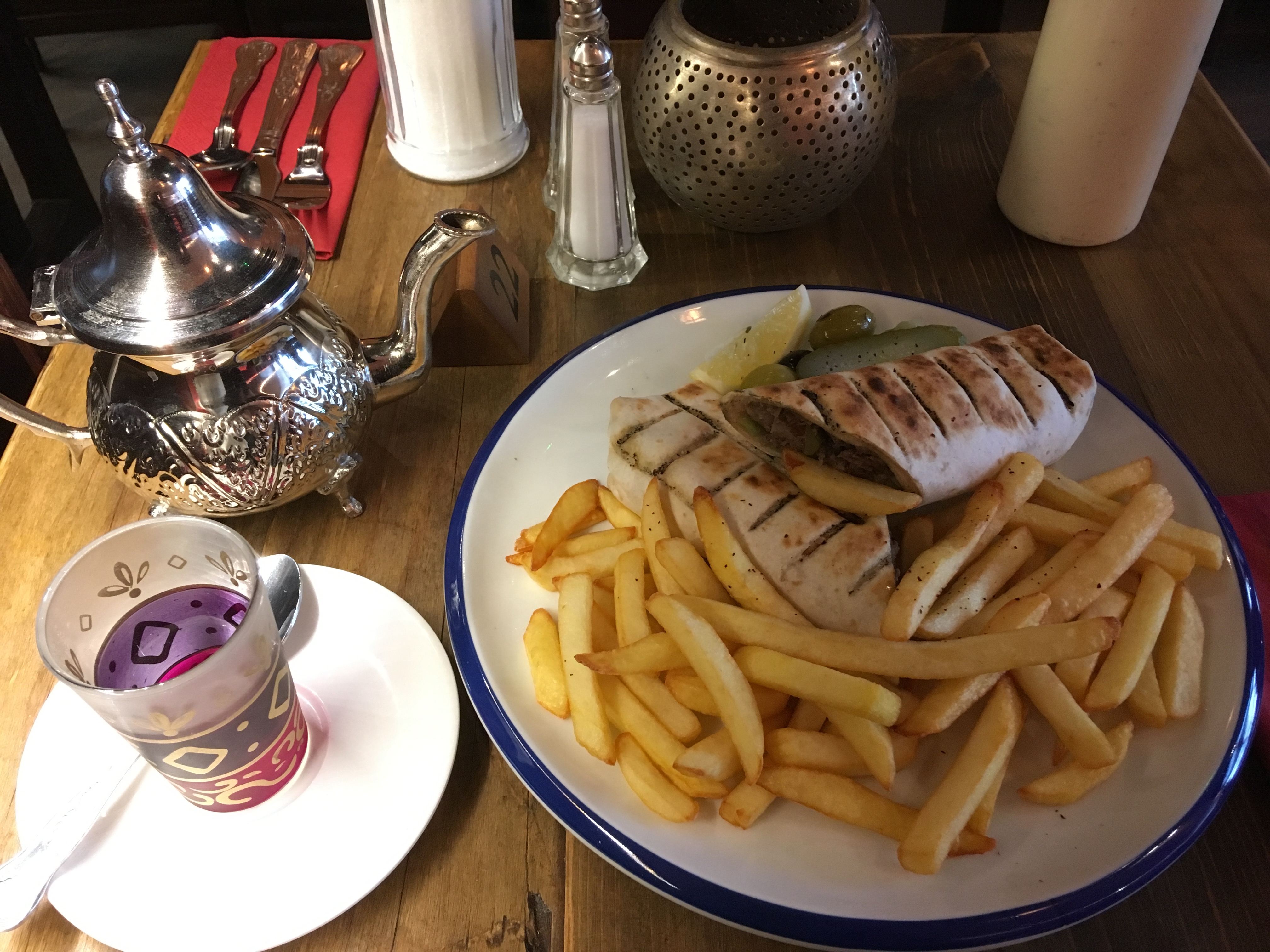The shawarma arrives quickly, though unexpectedly with chips rather than rice. It’s fairly uninspiring to look at: in comparison with the bright Moroccan tiles and fabrics of the restaurant, the colourful dishes illustrated on the menu and the freshness promised by the tea, it’s distinctly beige. The wrap itself is quite thin, more like a Costa Coffee panini with an apportioned amount of filling and edges neatly pressed, rather than a thick, satisfying bit of street food, bulging with meat and salad.