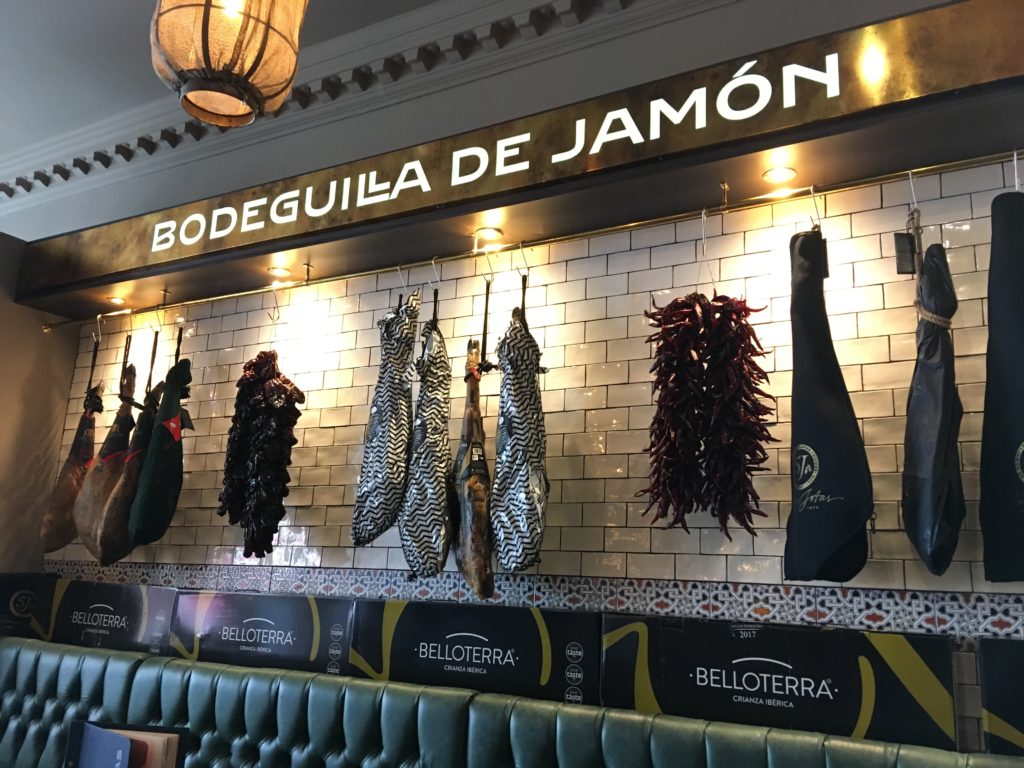 The main bar area is dominated by bright mural, bottles of highly decorative Vilarnau cava and a neon sign proclaiming “sherry is sexy”, while in the adjacent smaller dining room, dark wood panelling is accompanied by classy neutrals – taupe, pale grey and cappuccino – along with some riotous Spanish tiles and half a dozen hams hanging from butchers’ hooks just as you would find in Salamanca.