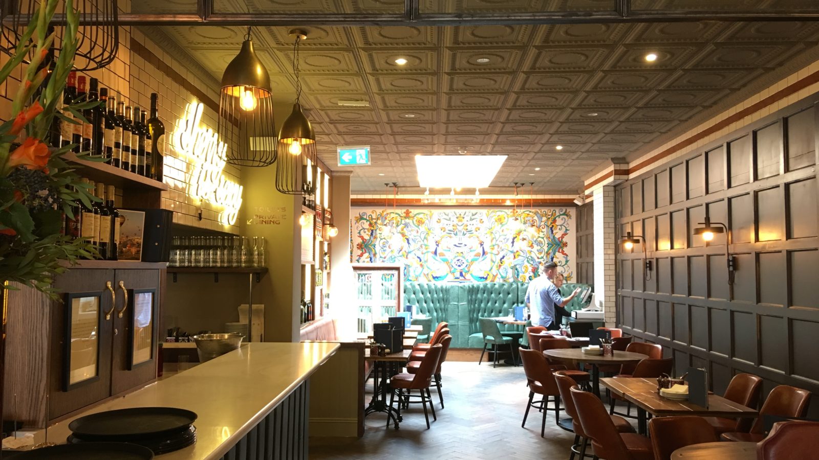 The main bar area is dominated by bright mural, bottles of highly decorative Vilarnau cava and a neon sign proclaiming “sherry is sexy”, while in the adjacent smaller dining room, dark wood panelling is accompanied by classy neutrals – taupe, pale grey and cappuccino – along with some riotous Spanish tiles and half a dozen hams hanging from butchers’ hooks just as you would find in Salamanca.