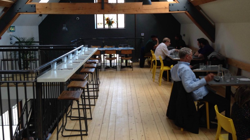 The main dining room is upstairs, with a few yellow chairs among the wooden tables, floor and overhanging beams.