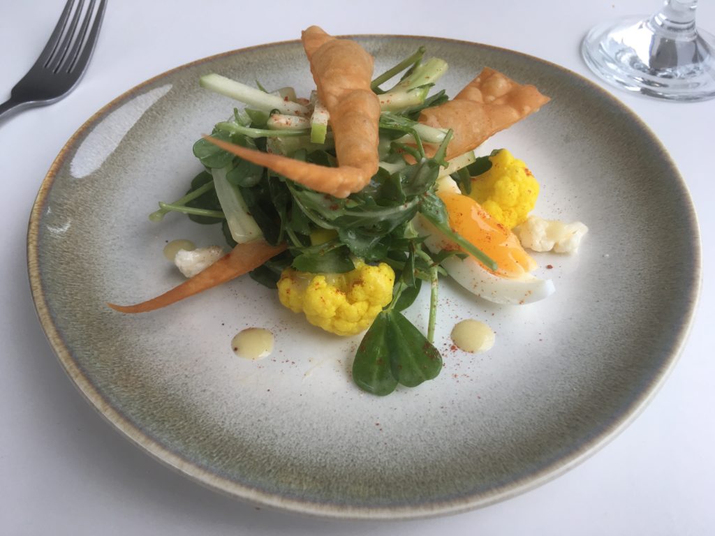 The coddled eggs are perfectly cooked with shiny soft yolk, finished with a light touch of dressing and sprinkling of paprika. A woman at another table asks the waitress what a coddled egg is and chef can be heard giving the answer from the kitchen. Tom comes over to the table: “I apologise for the chef, he’s from the north and he’s got a very loud voice,” he jokes. “You’ll be hearing him all night.”