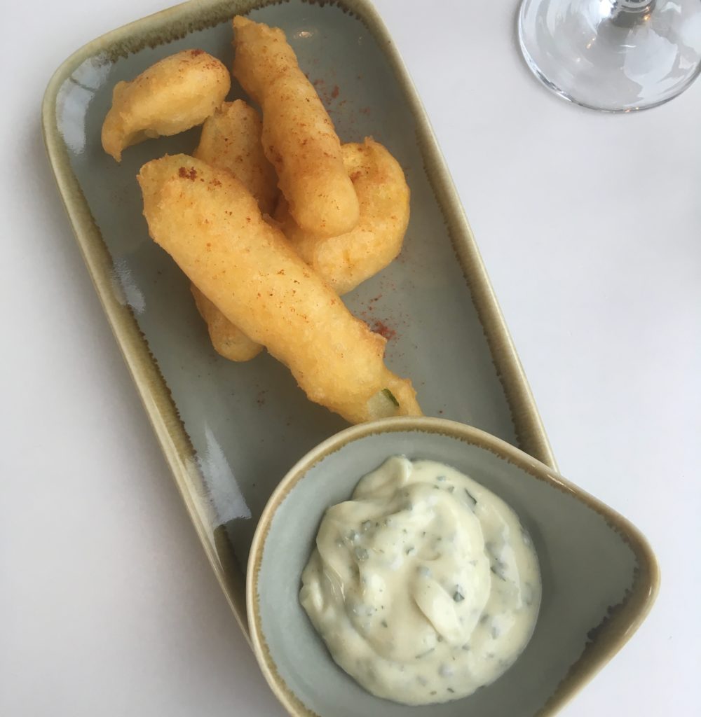 Food comes out when it’s ready and there is a bit of a pause before the courgette fritters with herb mayo (£6) arrive, but they are piping hot when they do. Slices of green and yellow courgette retain their texture – soft but not slimy – inside their casings of light batter, sprinkled liberally with paprika once again, and are lovely with the herby, garlicky mayonnaise that is so fresh and thick you could stand a spoon up in it.