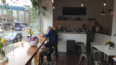 There was an extensive cocktail menu in a booklet reminiscent of a school exercise book, with a sugar paper cover printed with technical drawings of herbs and plants, some of which filled the tall planters outside. With the floor-to-ceiling plate-glass doors folded back, these planters formed a shield between the drinkers and diners on the tables inside and outside – though not against the diesel grind of delivery vans reversing up and down Welshback.