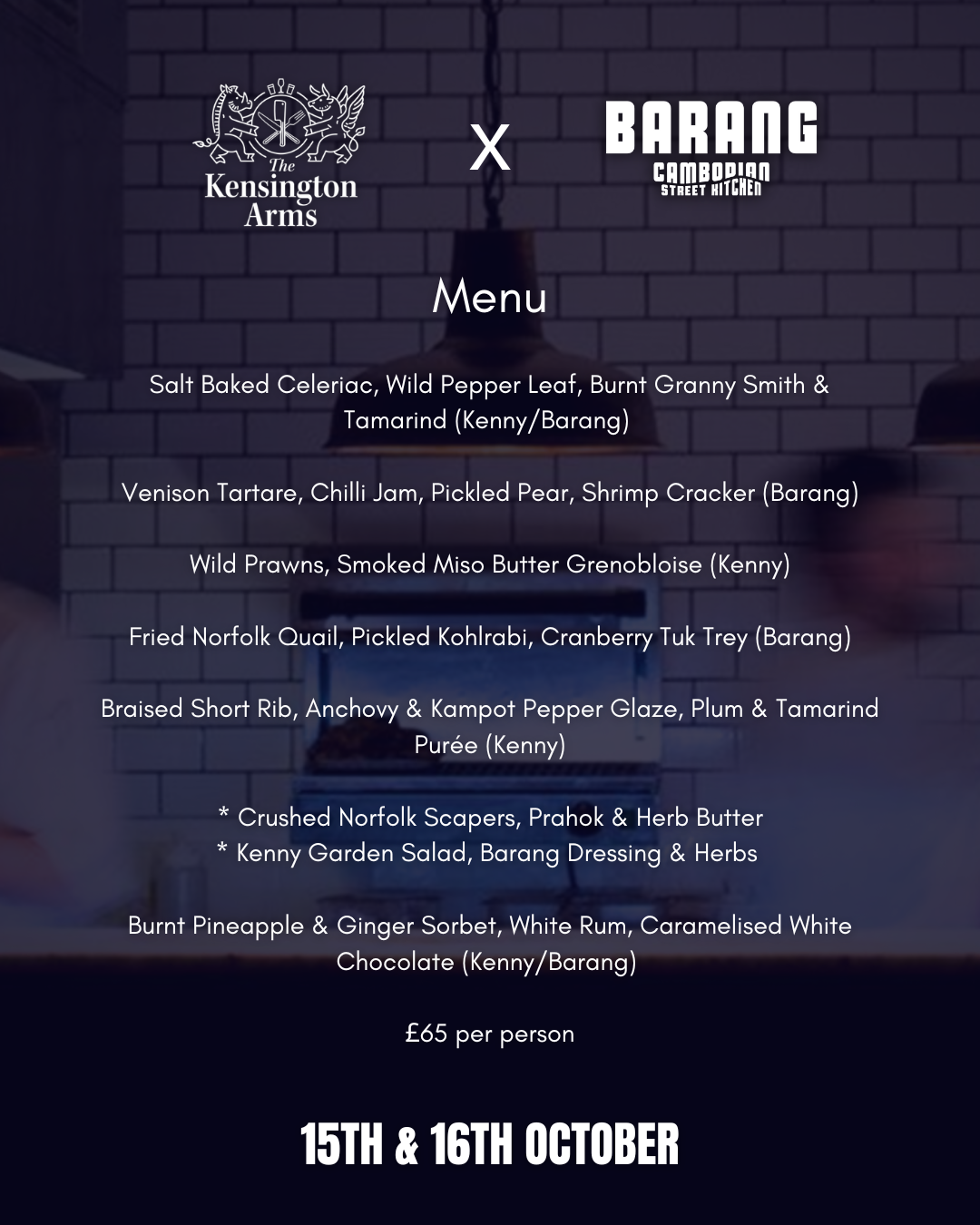 Tom Geoffrey, the founder of Barang, who focuses on Cambodian BBQ and regional Khmer dishes is teaming up with The Kensington Arms’ head chef Oscar Davis to present a, two night, exclusive six course set menu.