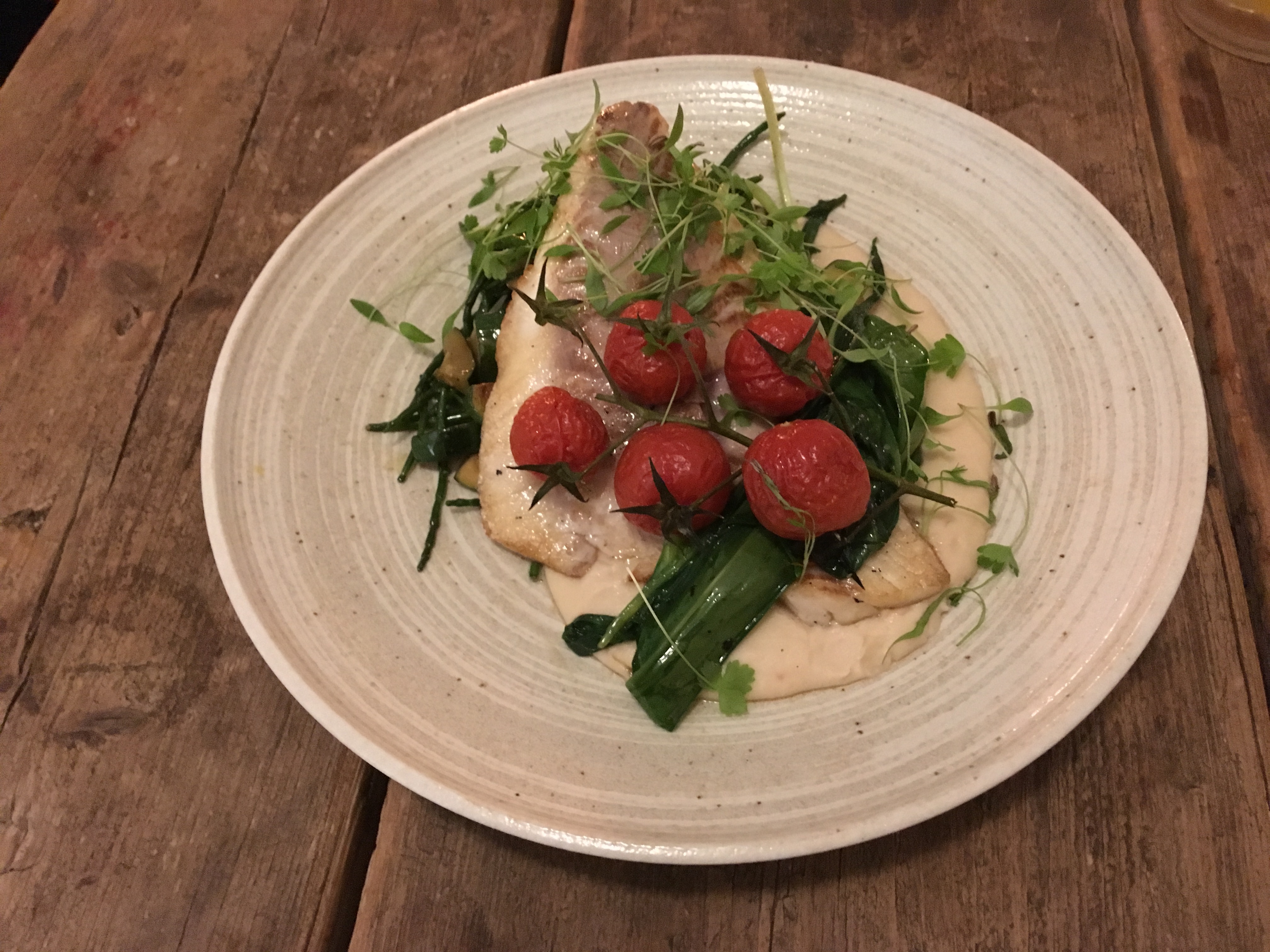 A beautiful plate of food arrives at the table, the green pops of the samphire and courgette salad contrasting with the bright red tomatoes and pale fish. The fillet is ever so slightly undercooked right in the middle, but it has delicious light flavour complimented by the smooth white bean purée. The tomatoes add a pop of sweetness, their juice spitting out when speared with a fork, while the salty samphire tastes like the sea. A light dressing on the salad with a hint of lemon freshens everything up.