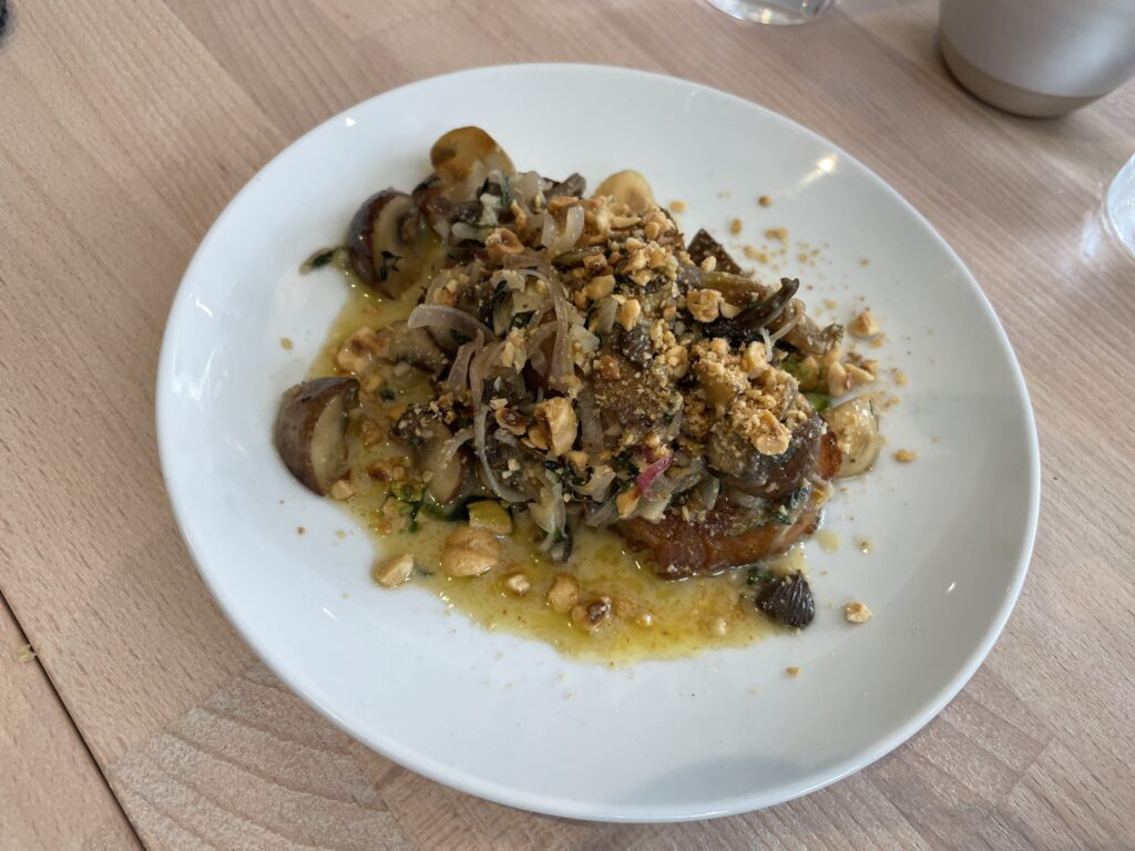 Mushrooms on brioche, Armagnac, shallot, hazelnut