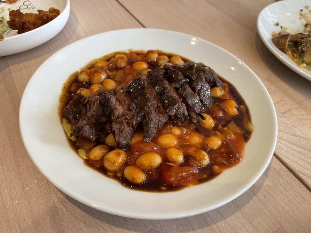 Hereford beef onglet, haricot beans, tomato frito, red wine jus