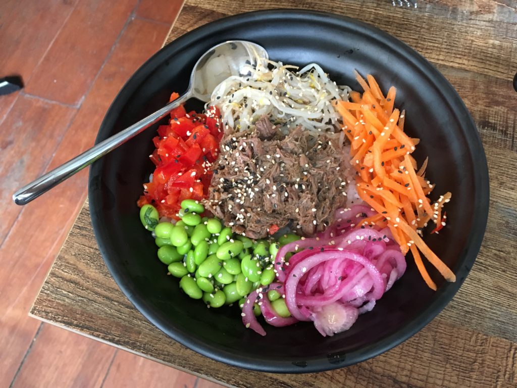 After being tempted by the soft Korean tacos – your choice of chicken, beef, prawns or squash (two for £7) – and contemplating the fried dumplings (£5.50), I plump for a bowl of deopbap (literally translates as ‘covered rice’) with vegetables, edamame beans, pickled red onion and beef over a bed of white rice (£8).
