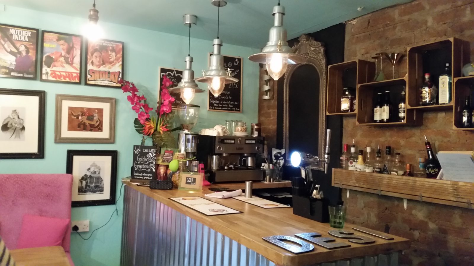 Framed Bollywood posters and artwork sit beside a large print promoting Desi’s ‘Tapas the Indian way’ over a long wooden table and comfortable pink seating, where a table of four are wisely holed up, food and drinks flowing, as they overlook the rain spattered decking outside.