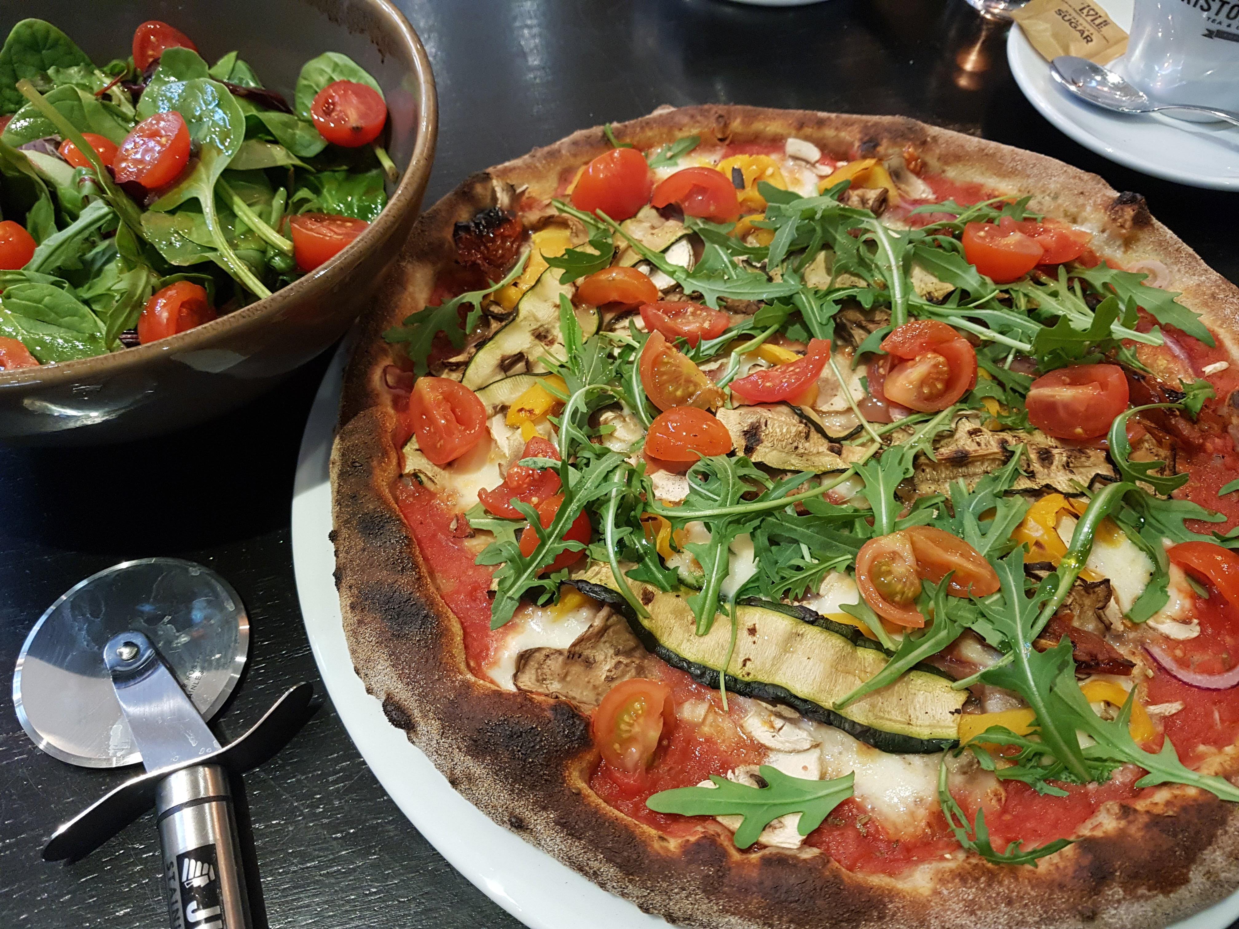The vegetarian pizza is soon delivered to the table (£12.95, plus £1 for the recommended hemp base and £1 for extra mushrooms), accompanied by a generous bowl of side salad (£3.50).