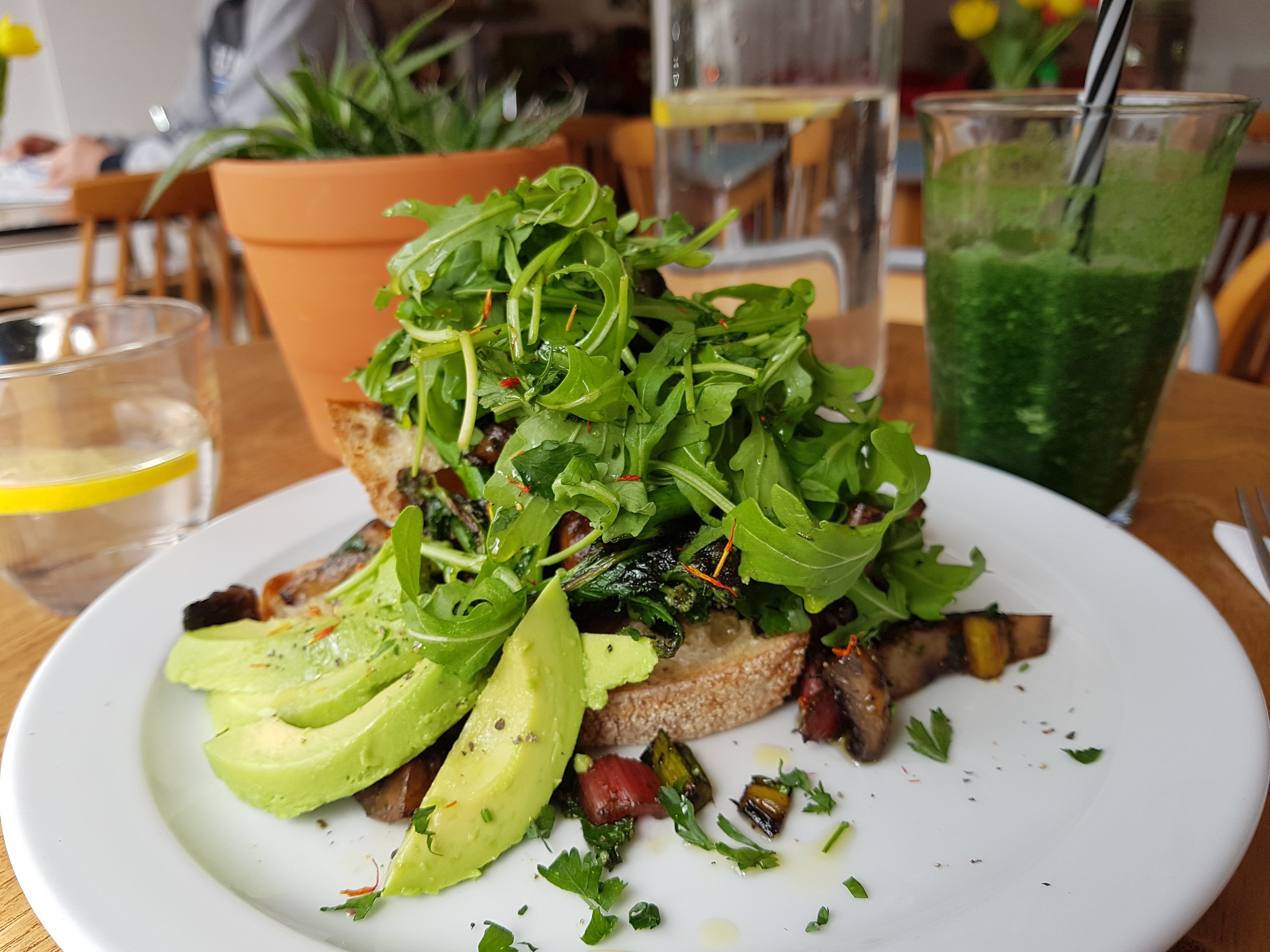 The plate is attractively piled with a heap of fat, glistening mushrooms, interspersed with delicate broccolini on crispy slices of sourdough toast, topped with a generous portion of rocket and sliced avocado to the side.