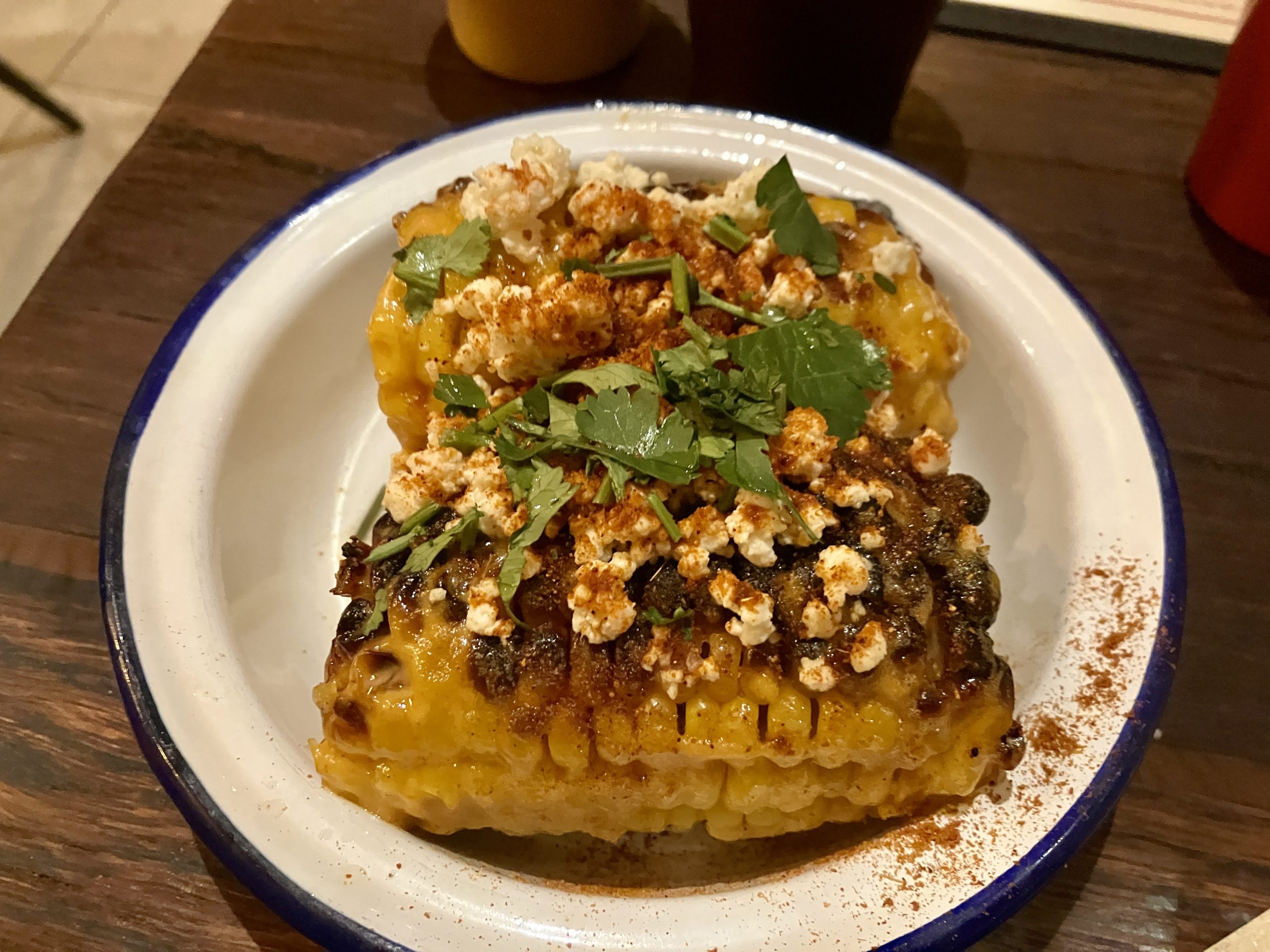 I ordered a tostada (£6.50) – fried tortillas topped with refried black beans, queso fresco (impressively made in house) and pico de gallo – topped with chicken tinga and grilled corn (£4), otherwise known as elotes.