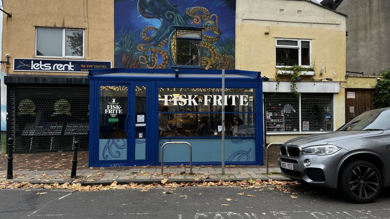 Having travelled over 50 minutes – including a short footbridge over the M32 – I was starving. So it’s only fair that I spotted Fisk & Frite’s blue glass box set up on Mina Road from a distance.