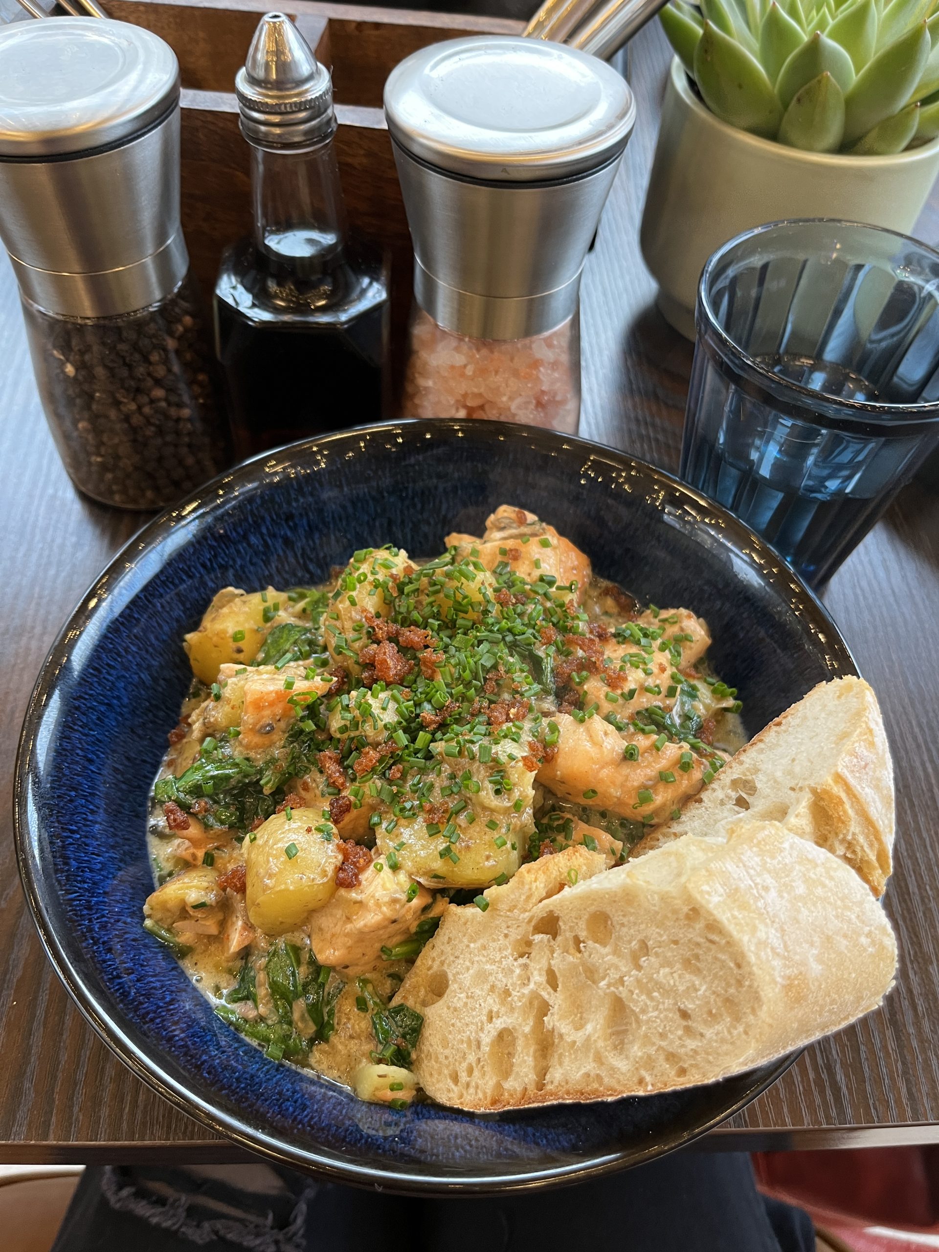 The salmon florentine arrived in a blue bowl, in keeping with the colours of the restaurant – photo: Karen Johnson