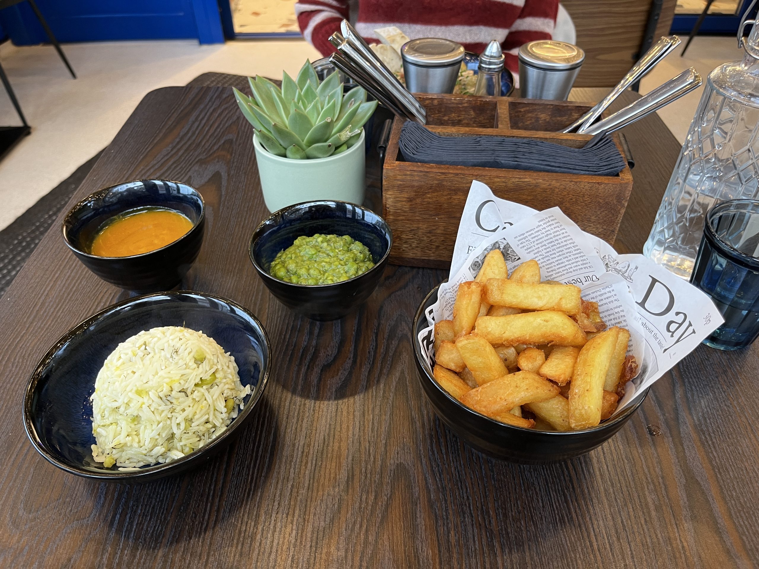 Moments later, we had ordered a salmon florentine, a battered cod, butterbean rice with dill, a side of hand-cut chips, mushy peas, curry sauce and garlic and chive mayo.